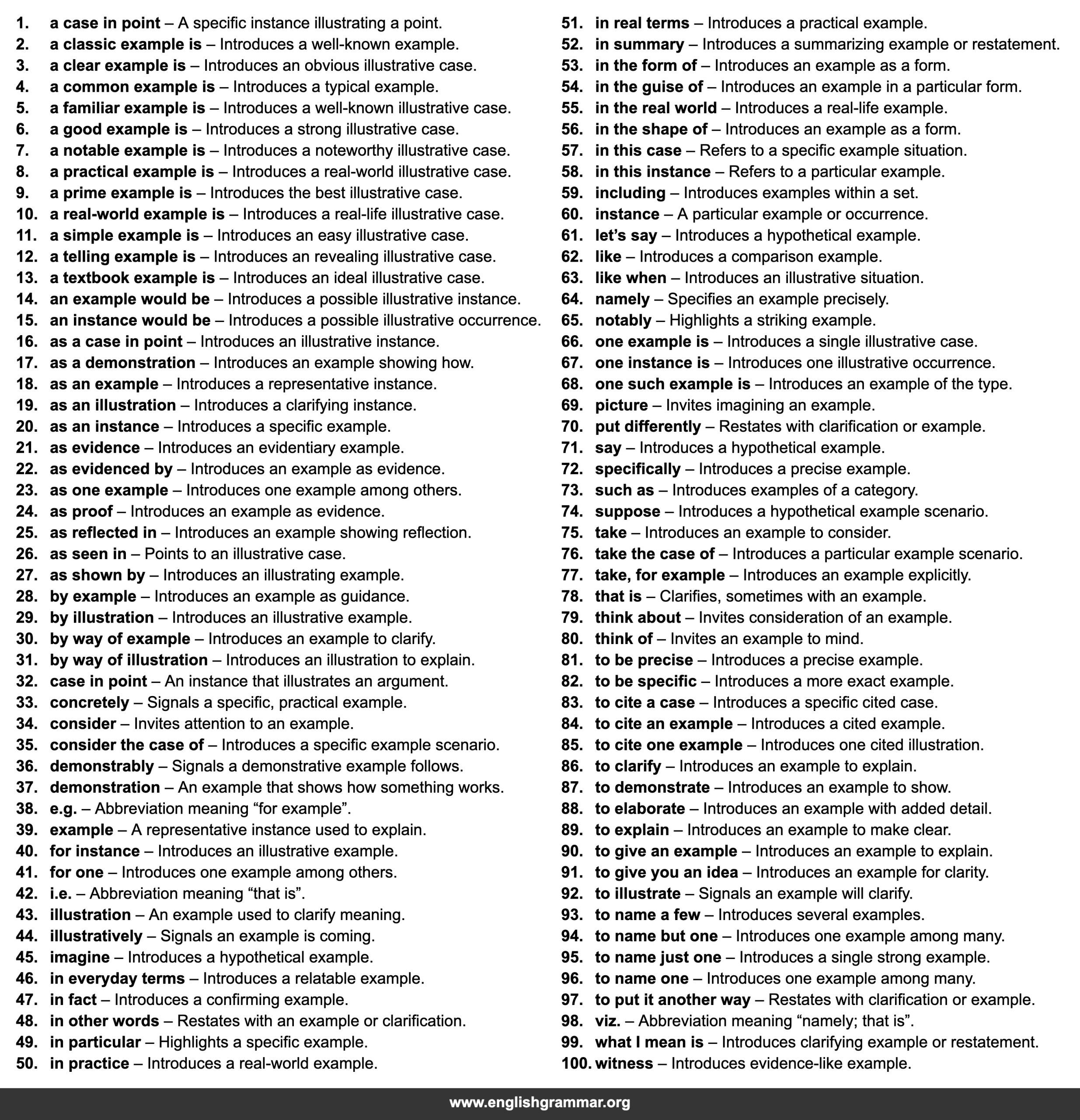 | 77. | take, for example | Introduces an example explicitly. |
