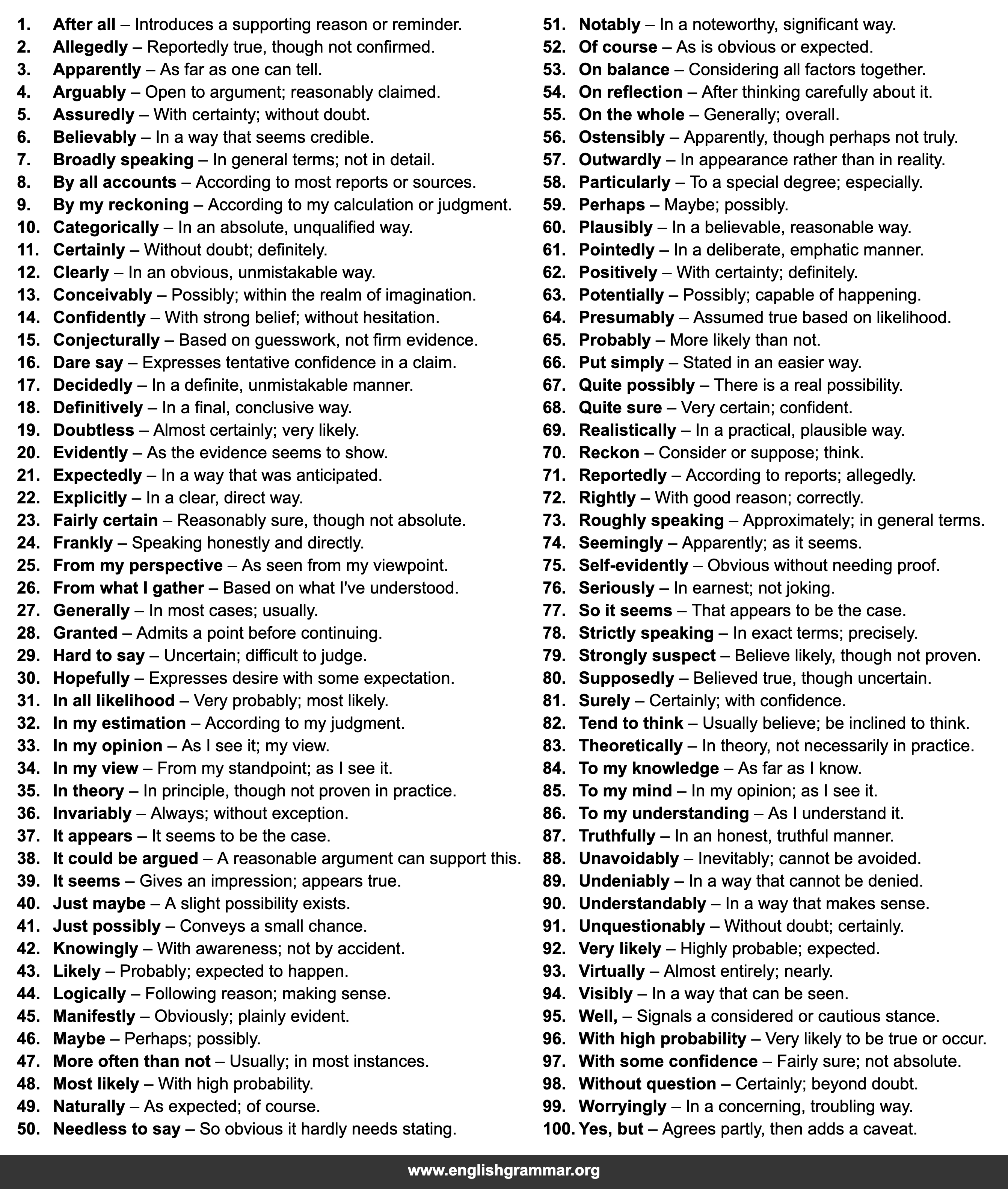 | 98. | Without question | Certainly; beyond doubt. |