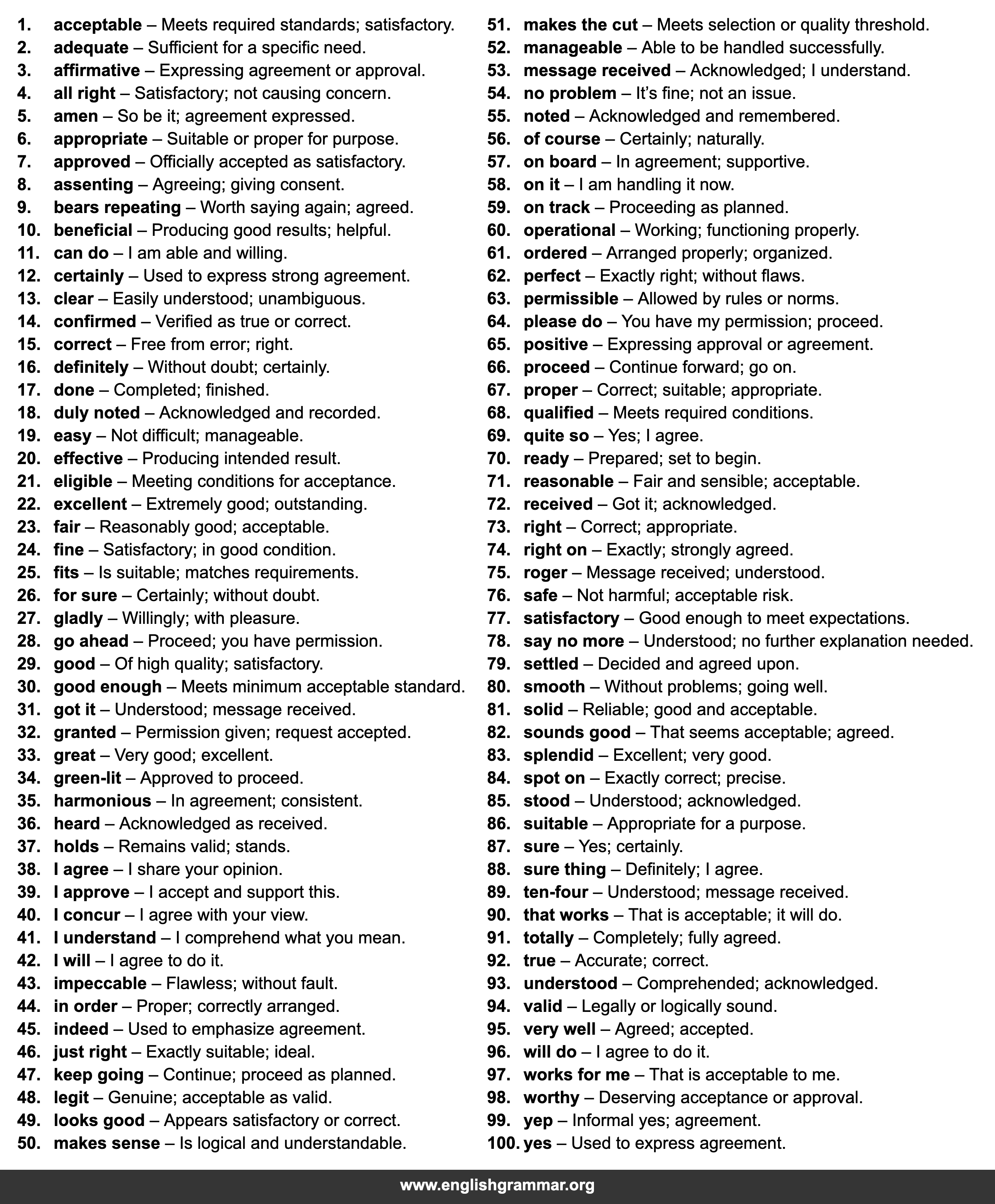 | 91. | totally | Completely; fully agreed. |