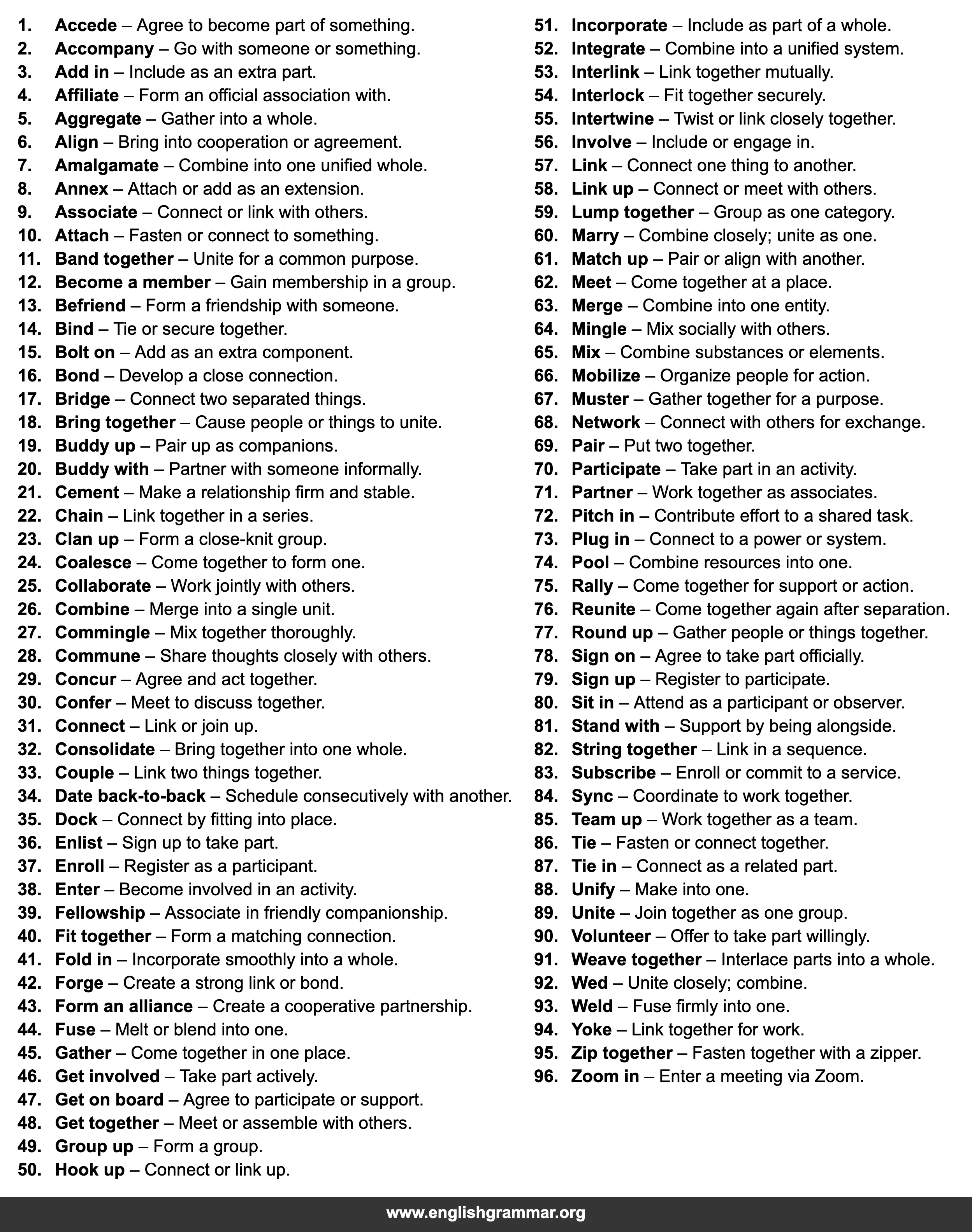 | 89. | Unite | Join together as one group. |