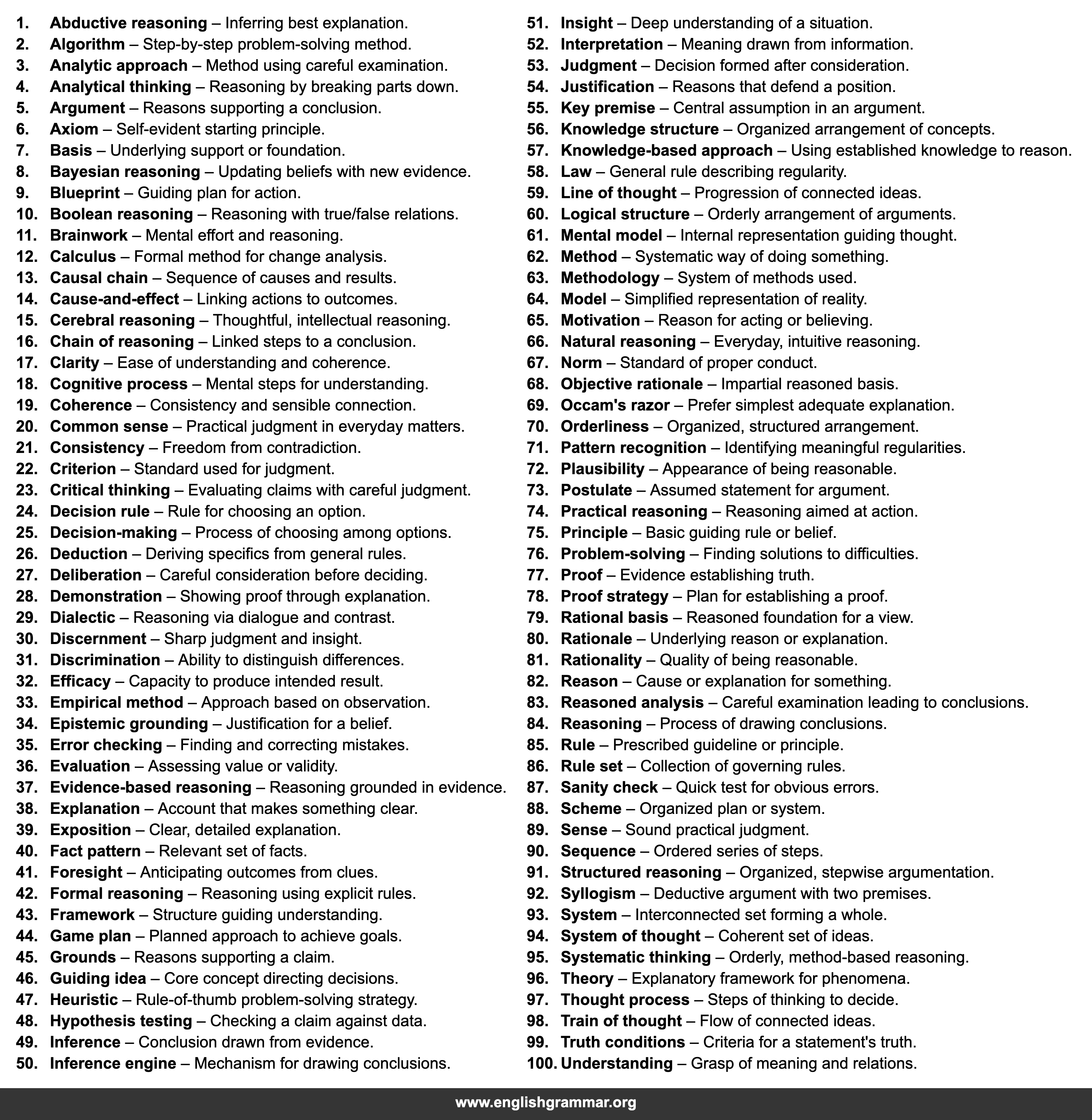 | 83. | Reasoned analysis | Careful examination leading to conclusions. |
