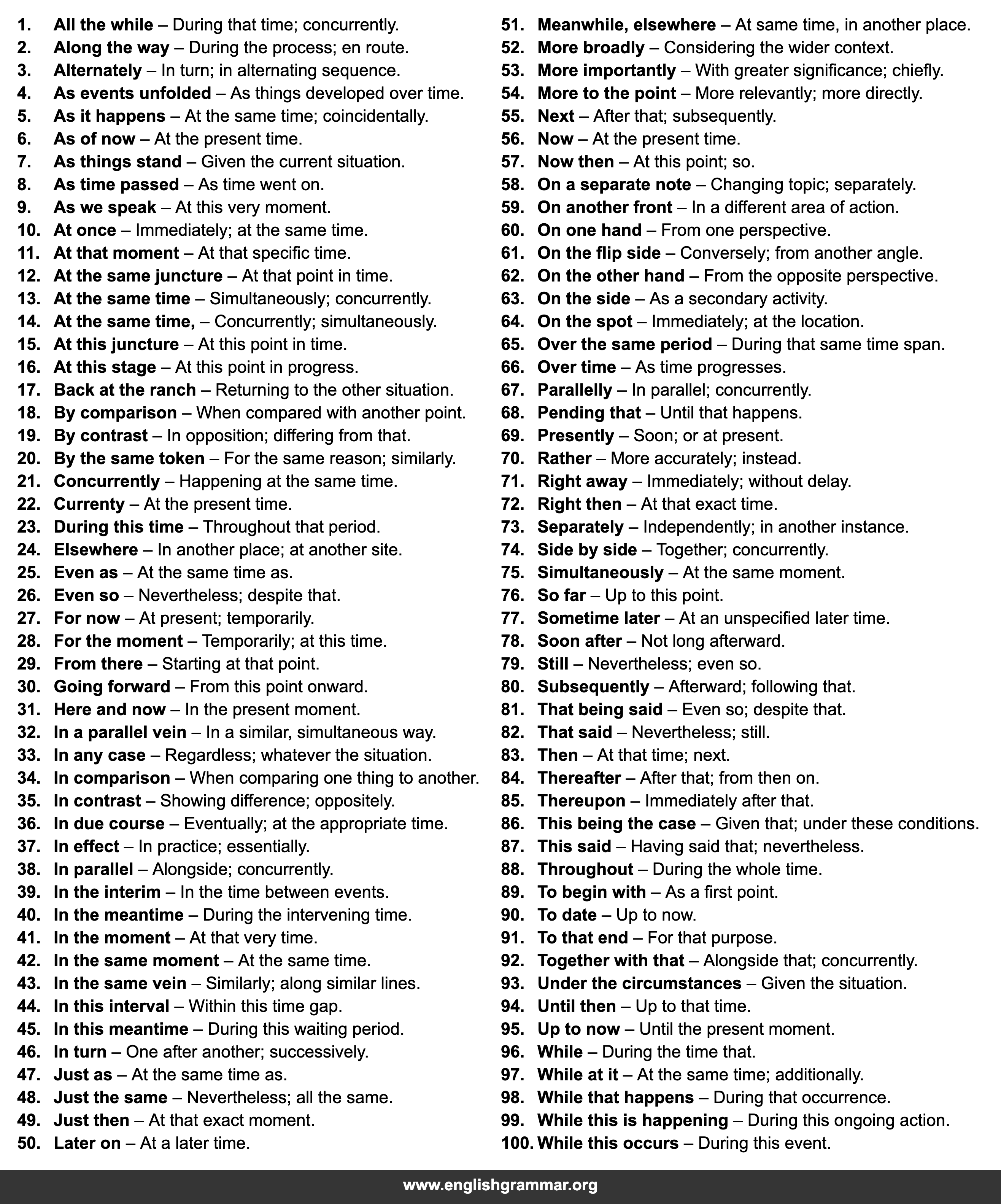| 13. | At the same time | Simultaneously; concurrently. |