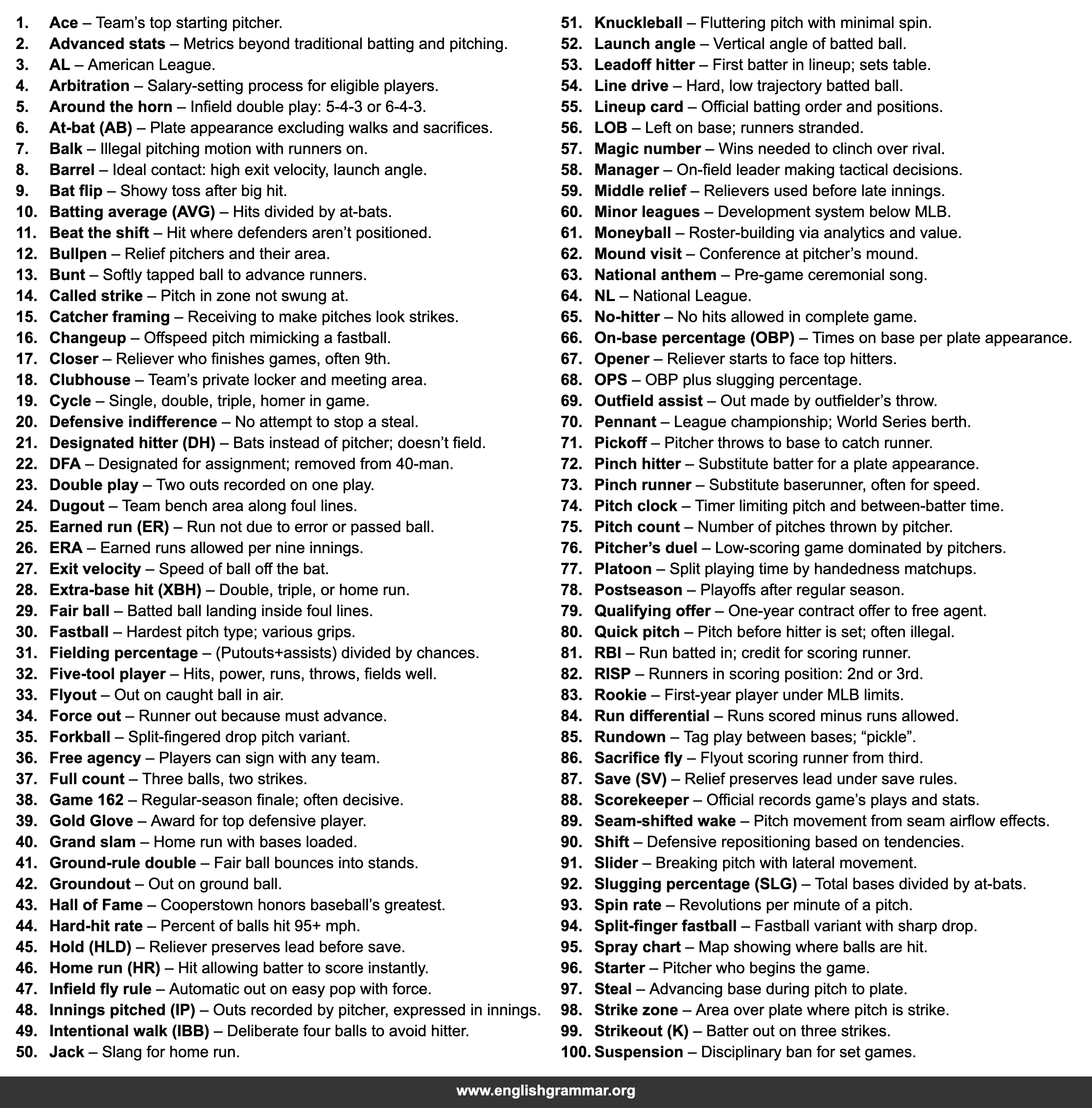 | 30. | Fastball | Hardest pitch type; various grips. |