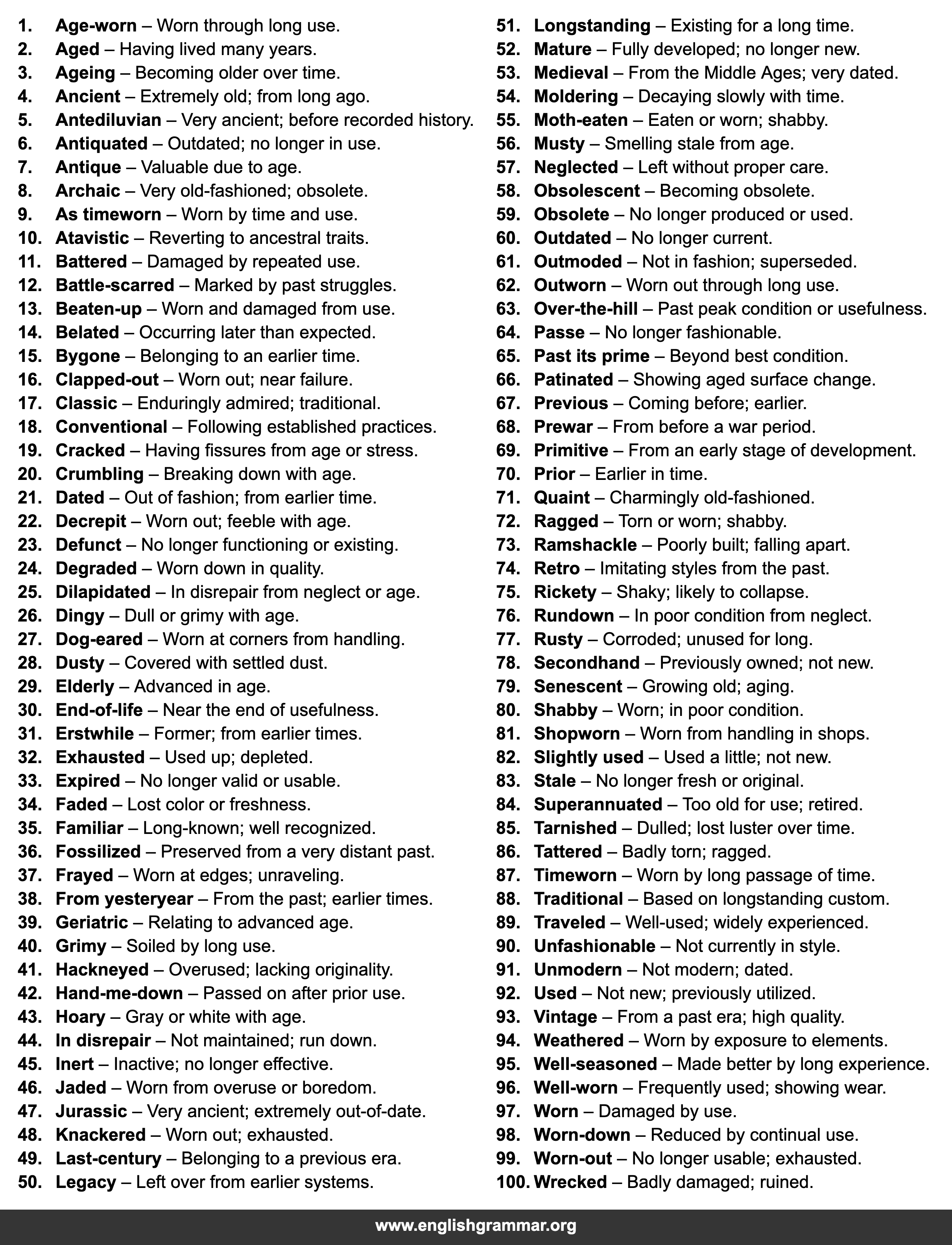 | 99. | Worn-out | No longer usable; exhausted. |