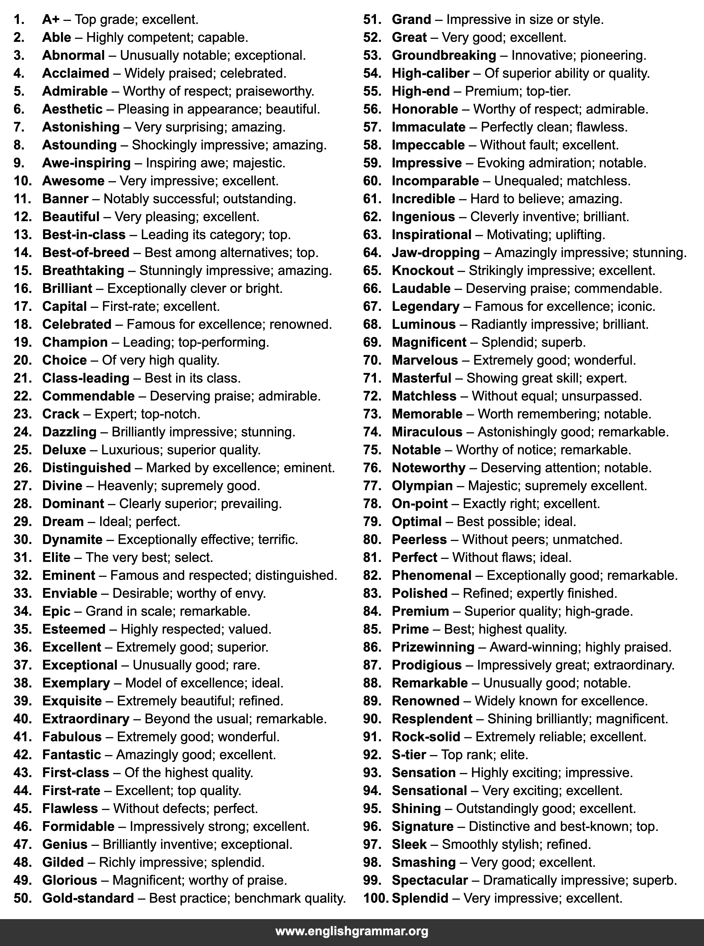 | 44. | First-rate | Excellent; top quality. |
