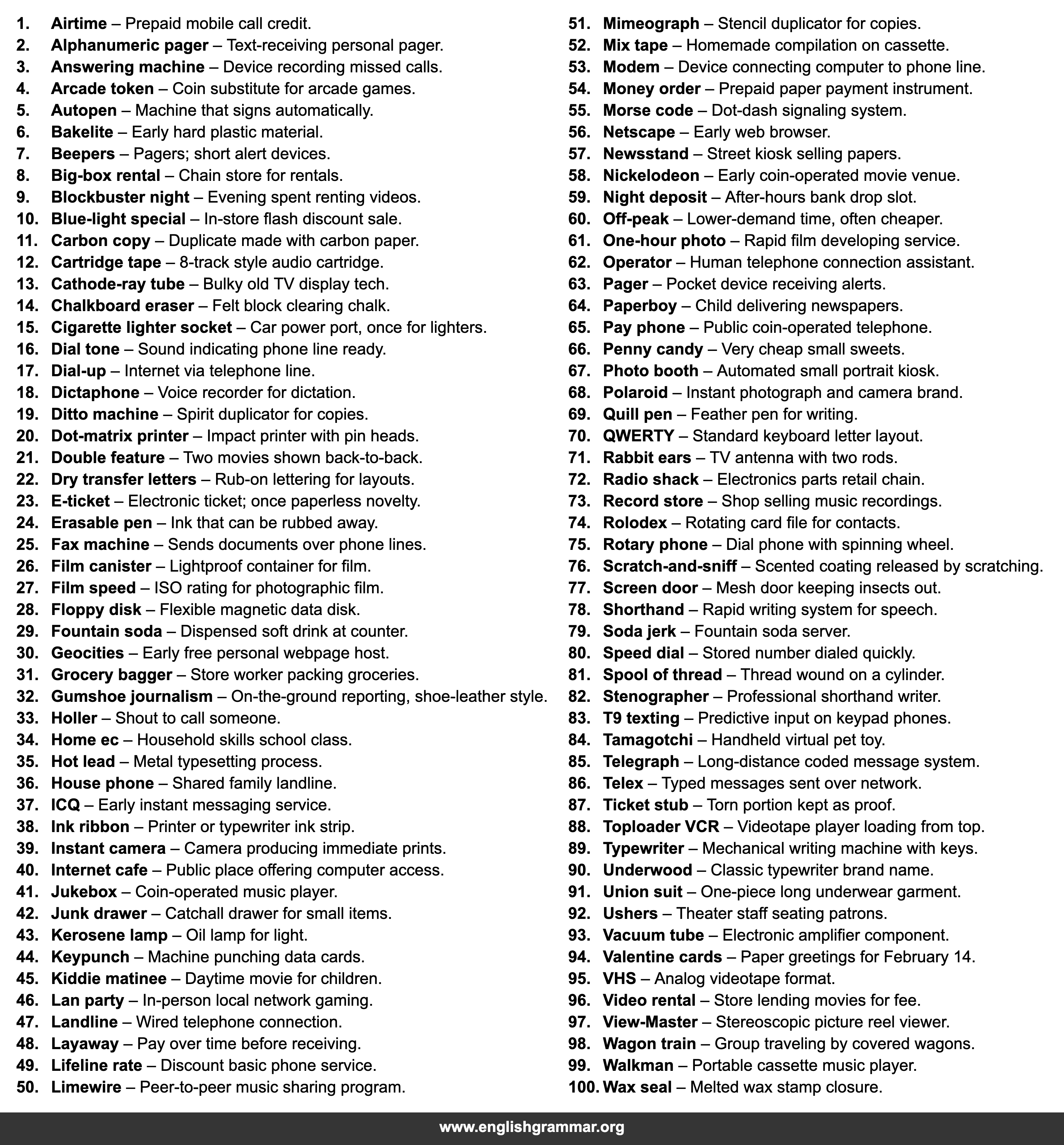 | 65. | Pay phone | Public coin-operated telephone. |