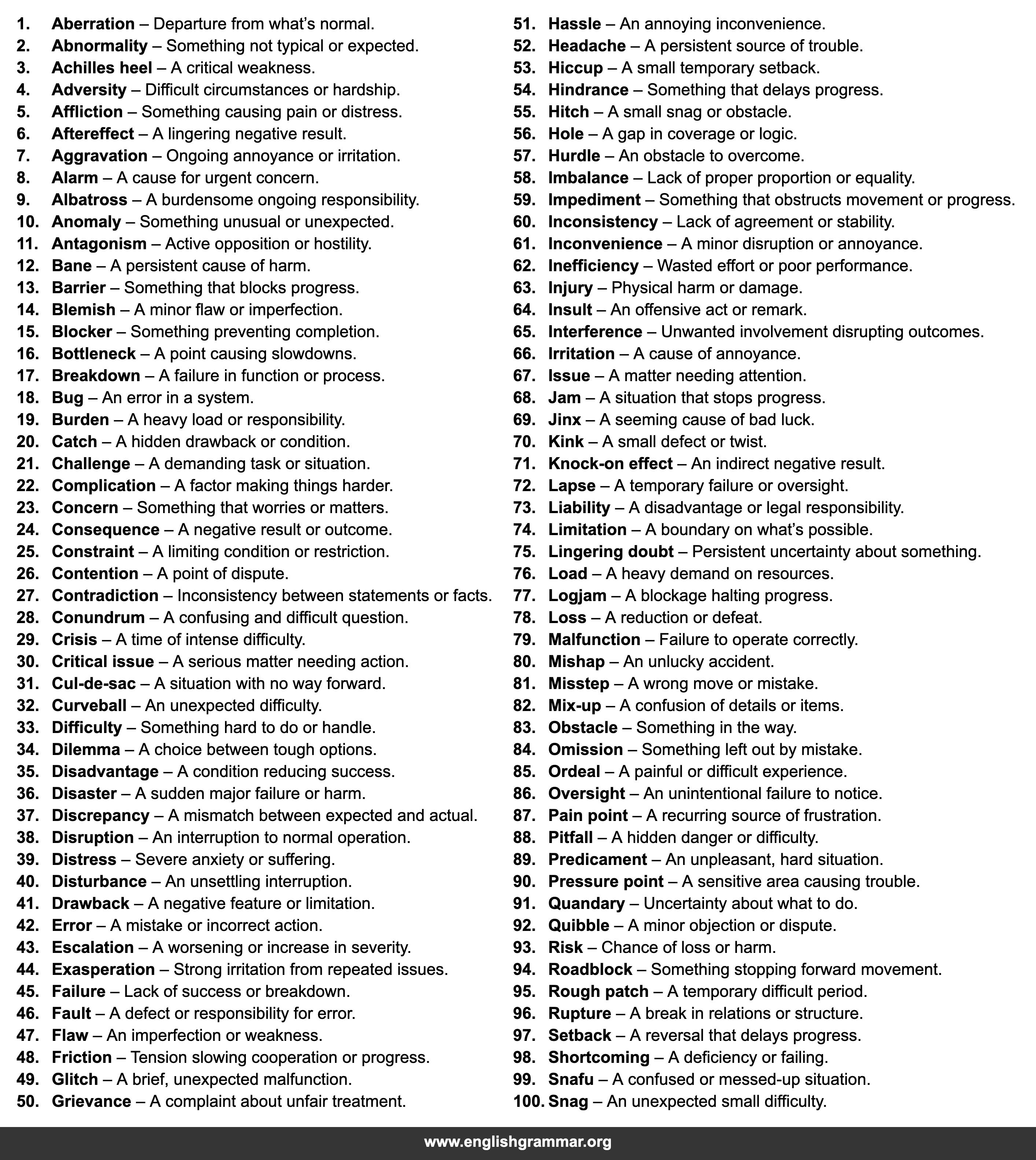 | 100. | Snag | An unexpected small difficulty. |