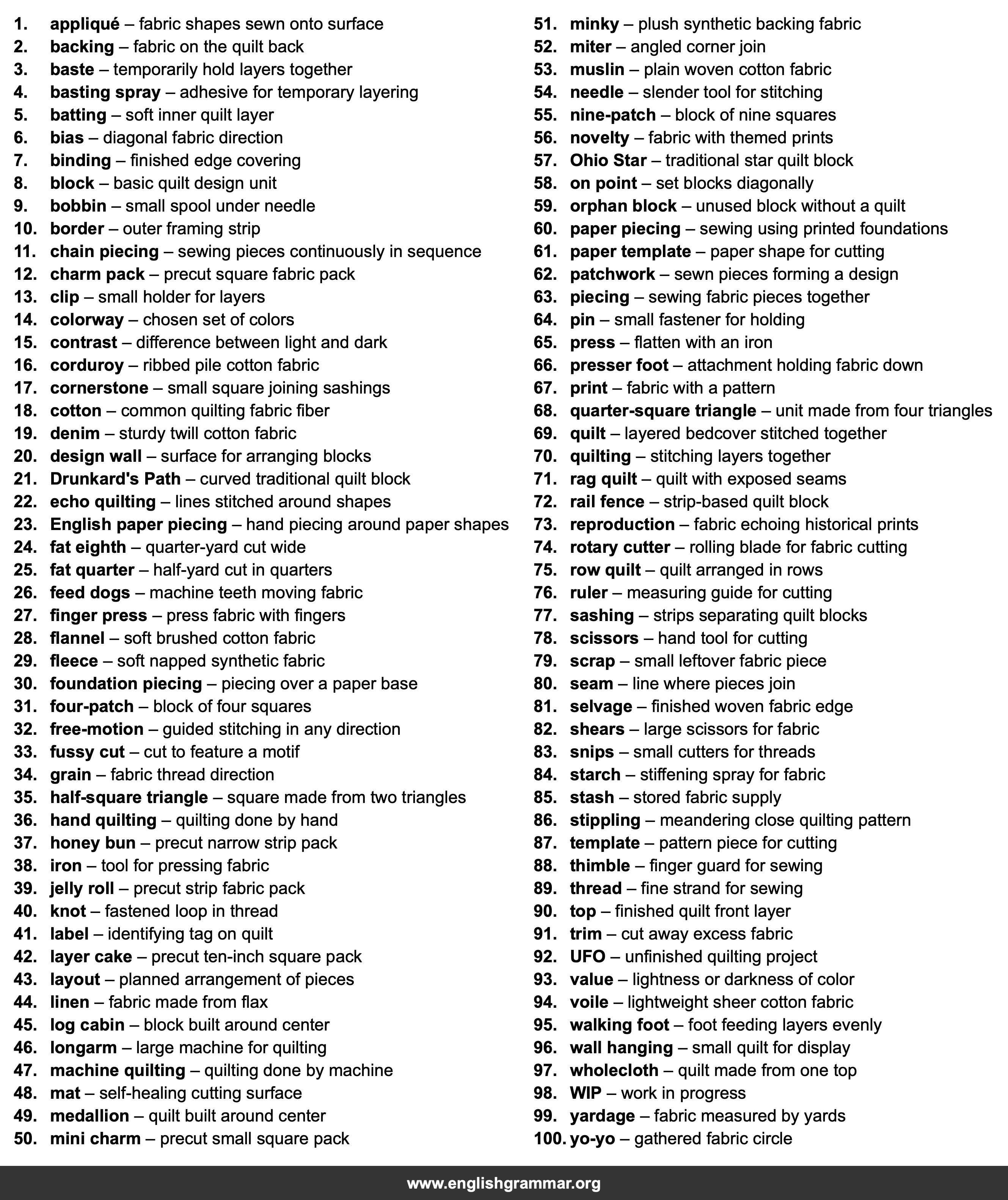 | 11. | chain piecing | sewing pieces continuously in sequence |