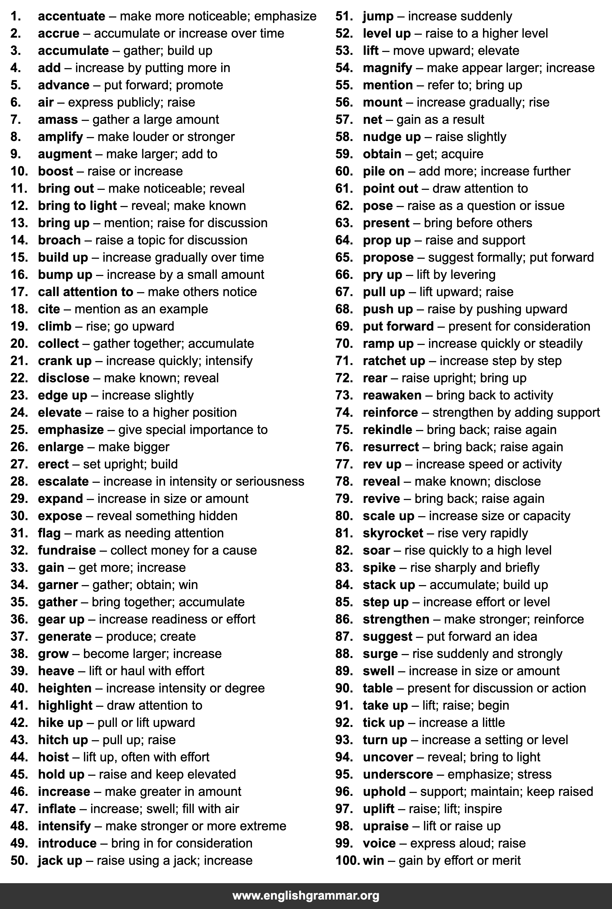 | 46. | increase | make greater in amount |