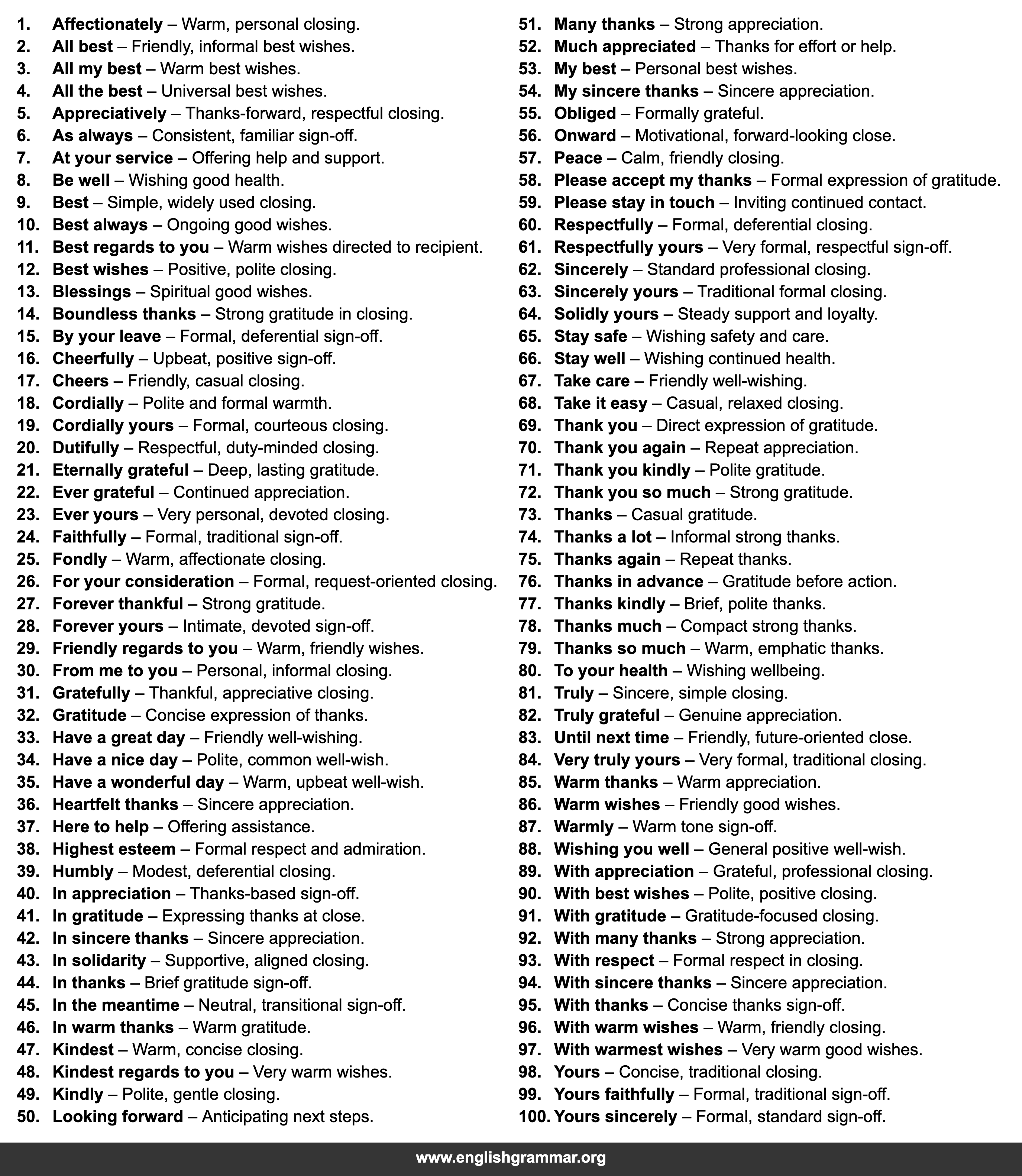 | 91. | With gratitude | Gratitude-focused closing. |