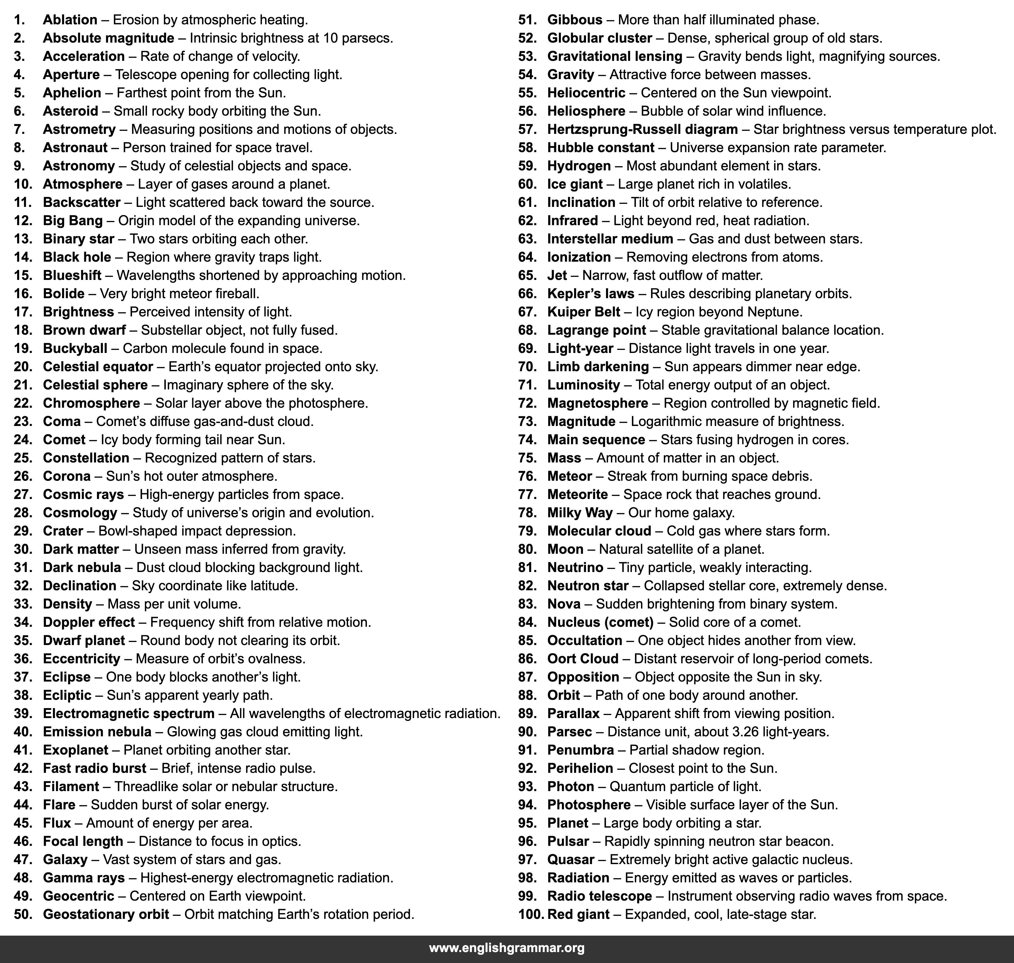| 90. | Parsec | Distance unit, about 3.26 light-years. |