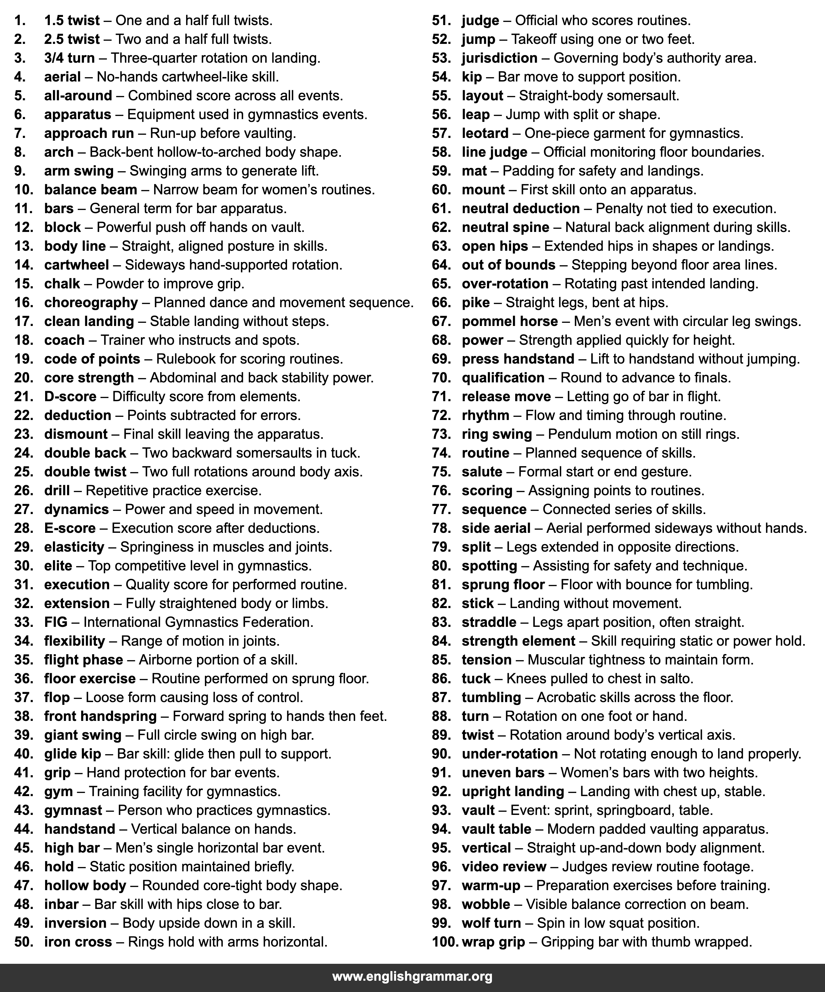 | 23. | dismount | Final skill leaving the apparatus. |
