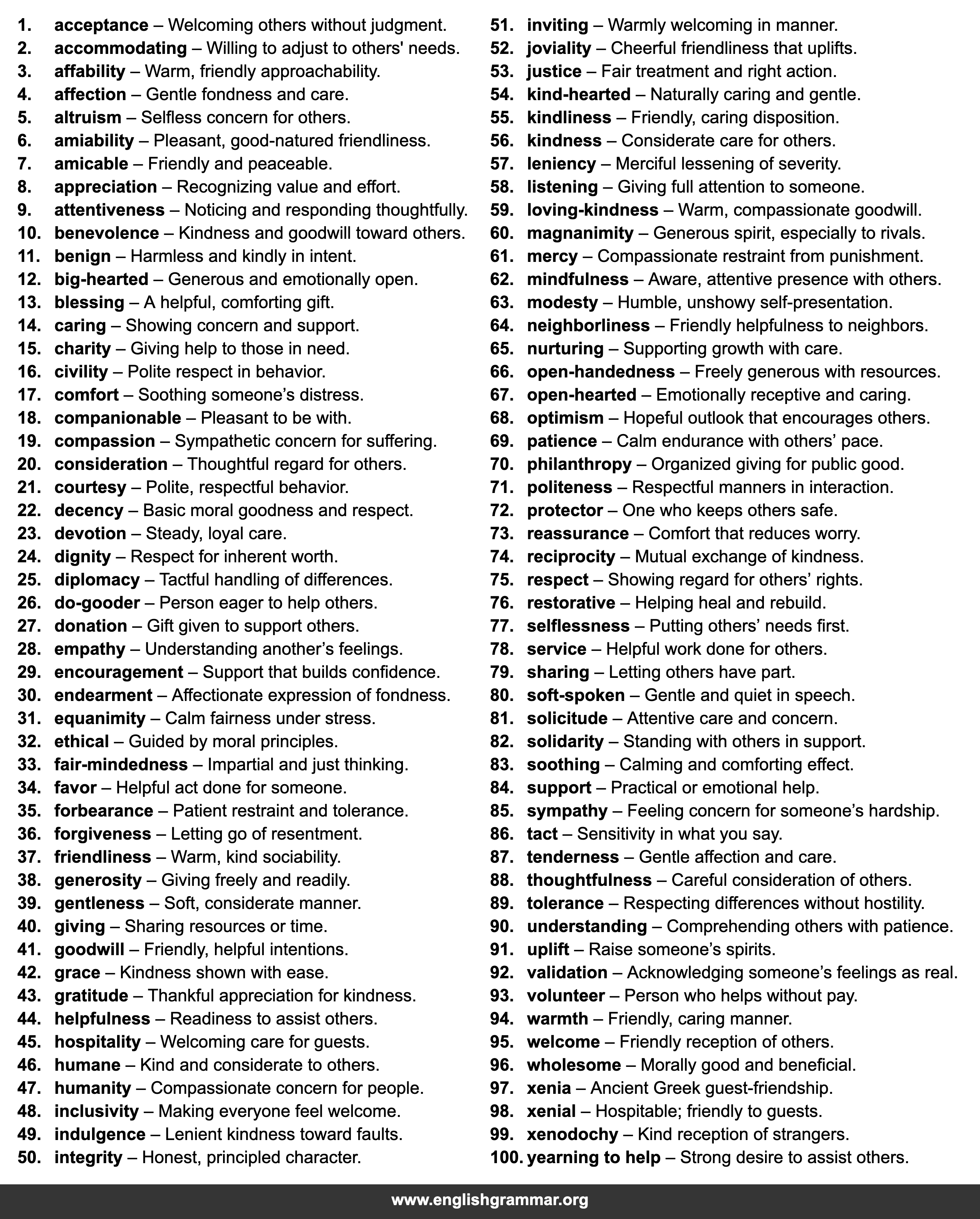 | 59. | loving-kindness | Warm, compassionate goodwill. |