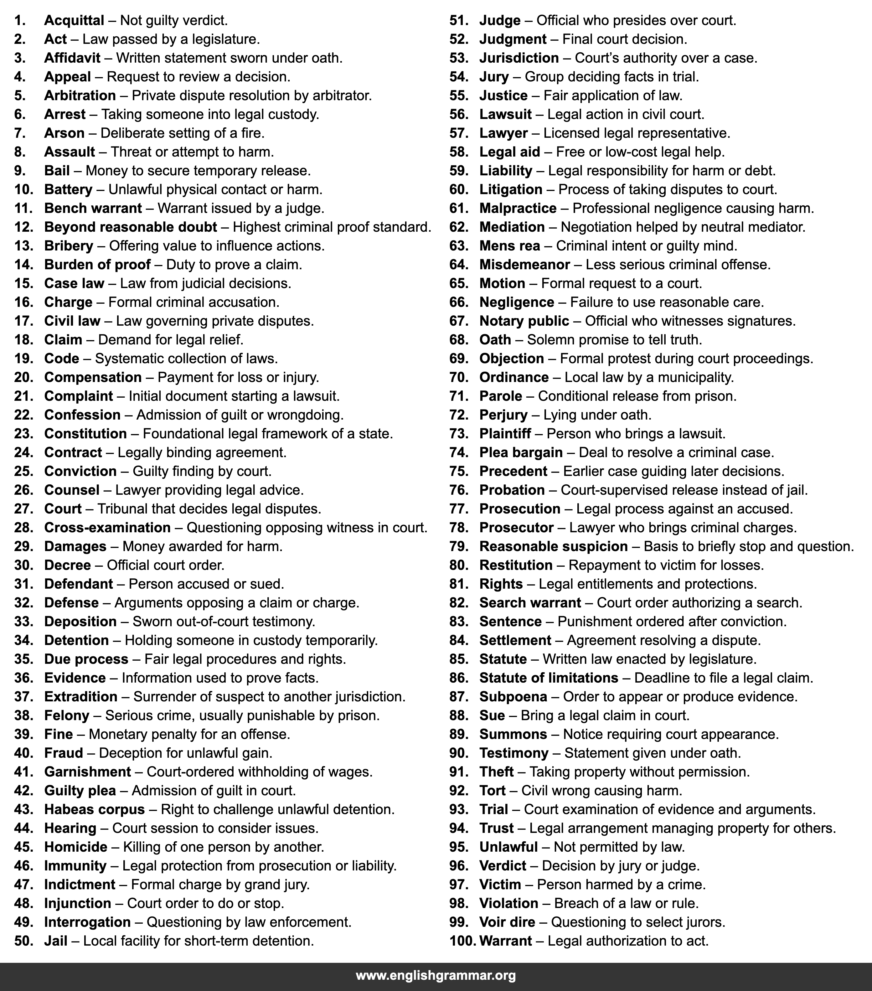 | 38. | Felony | Serious crime, usually punishable by prison. |