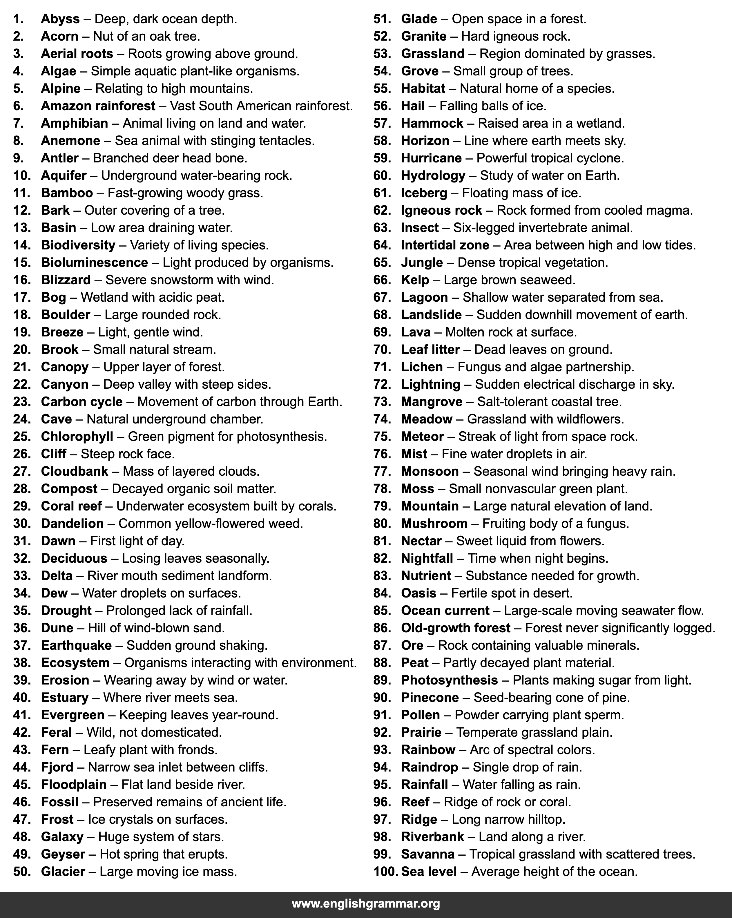 | 100. | Sea level | Average height of the ocean. |