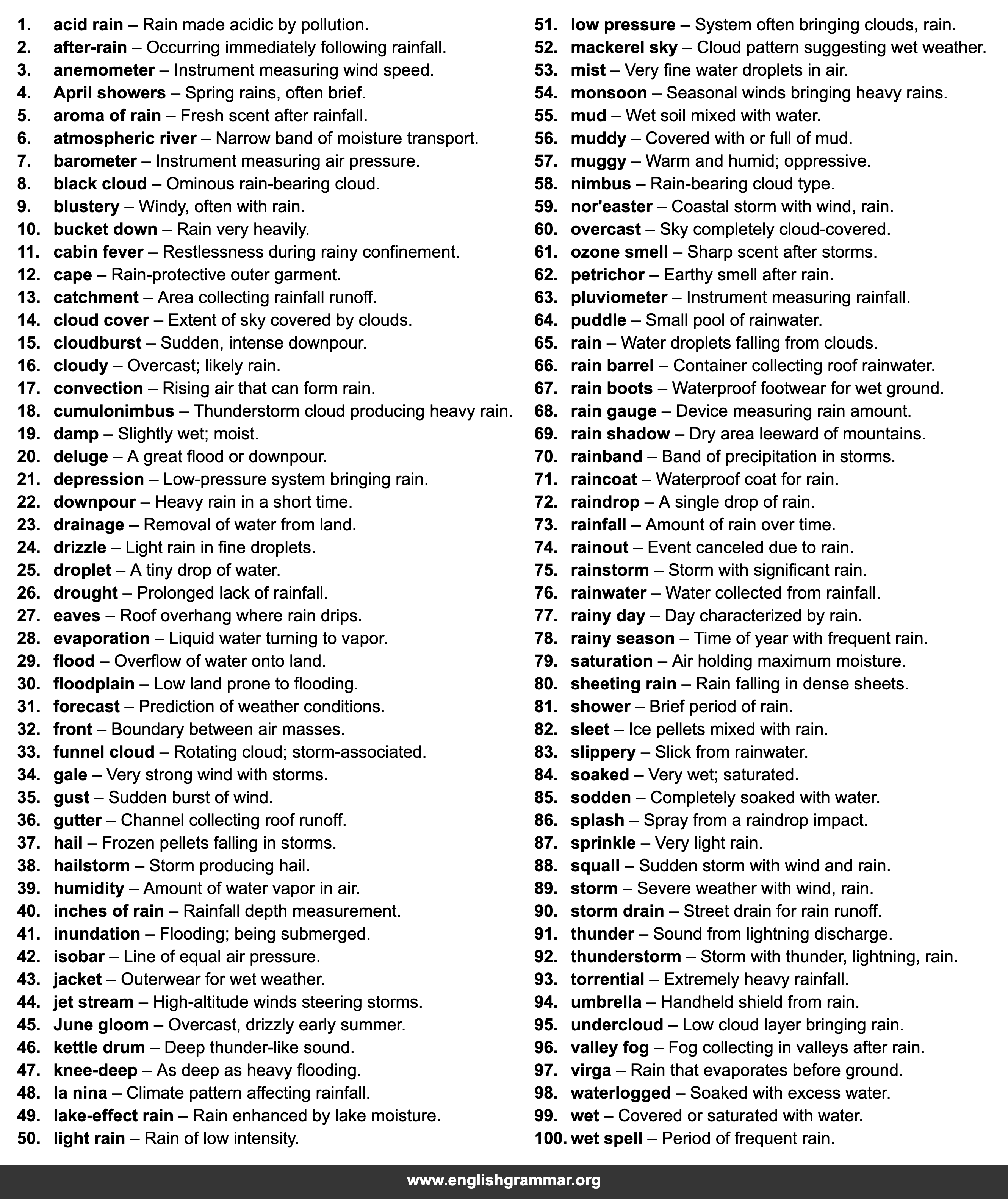 | 75. | rainstorm | Storm with significant rain. |
