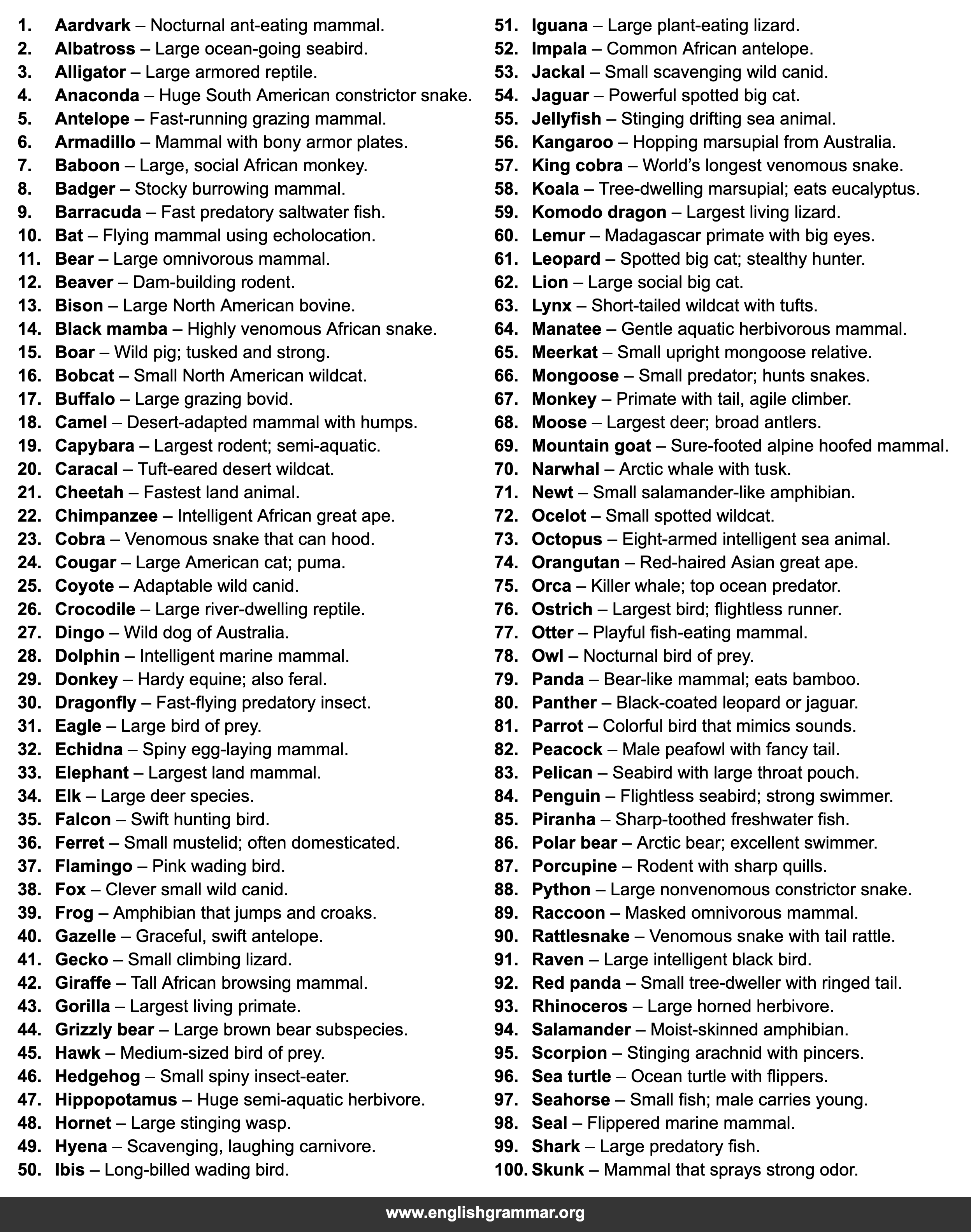 | 1. | Aardvark | Nocturnal ant-eating mammal. |