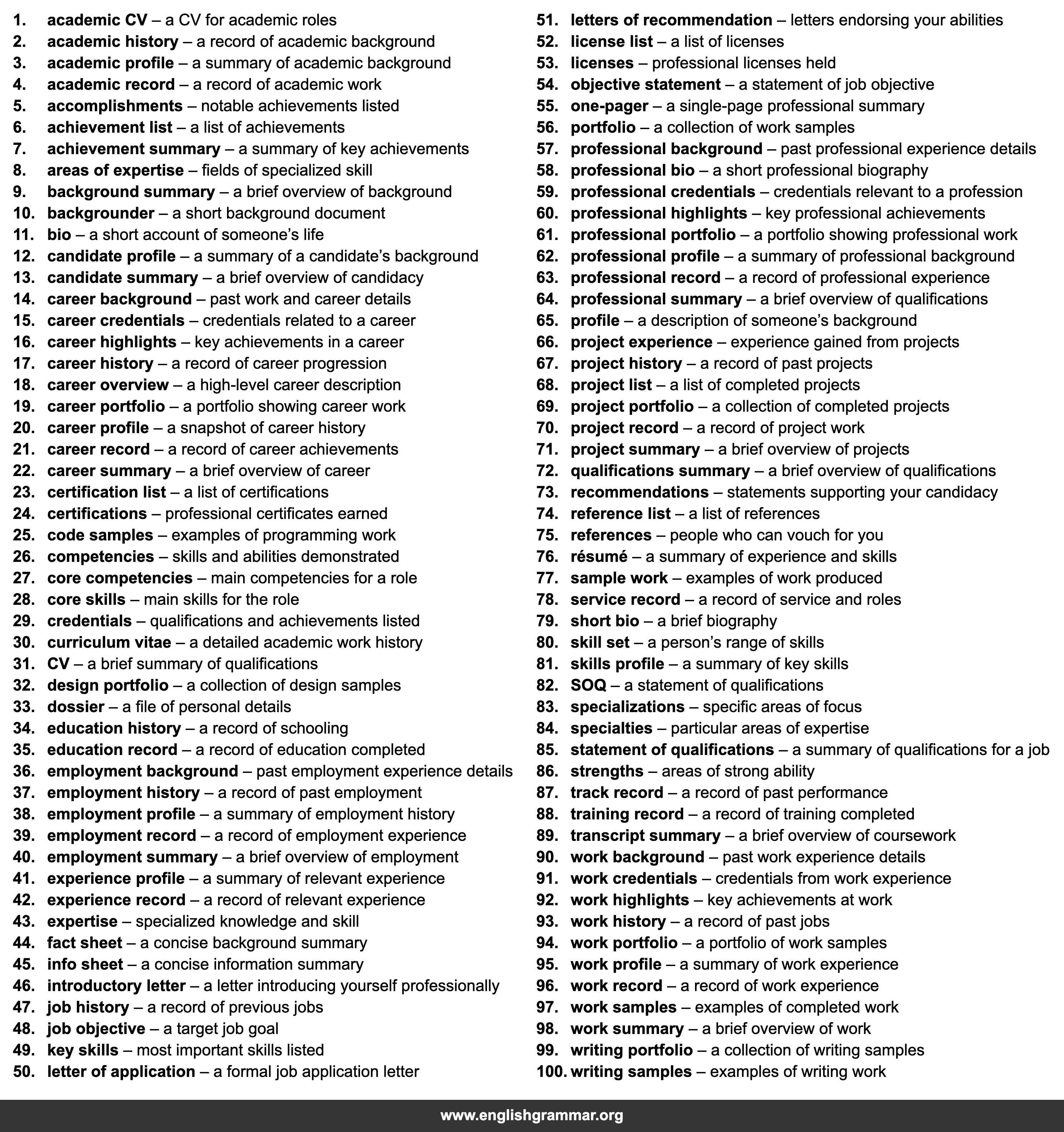 | 76. | résumé | a summary of experience and skills |