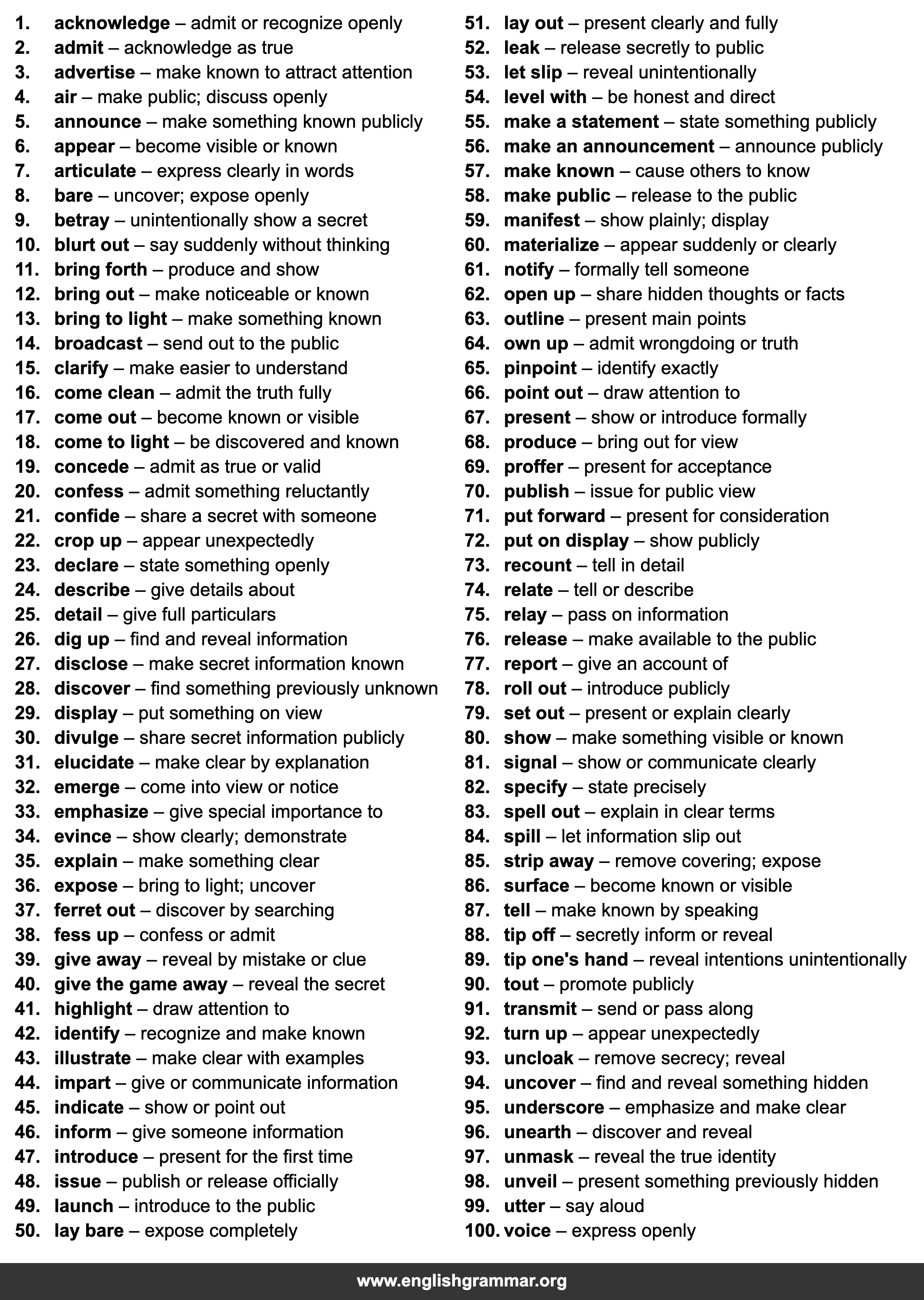 | 27. | disclose | make secret information known |
