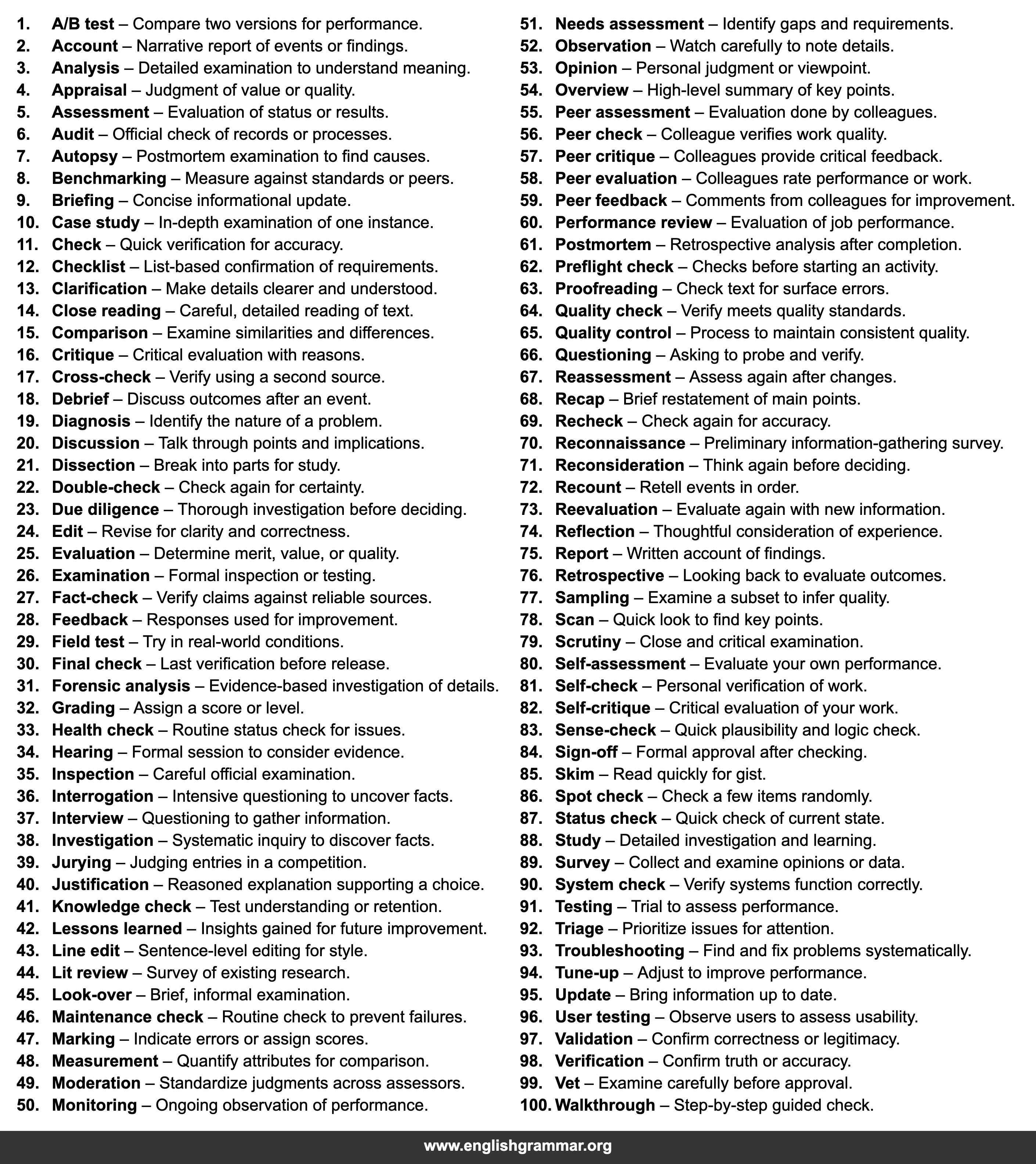 | 98. | Verification | Confirm truth or accuracy. |