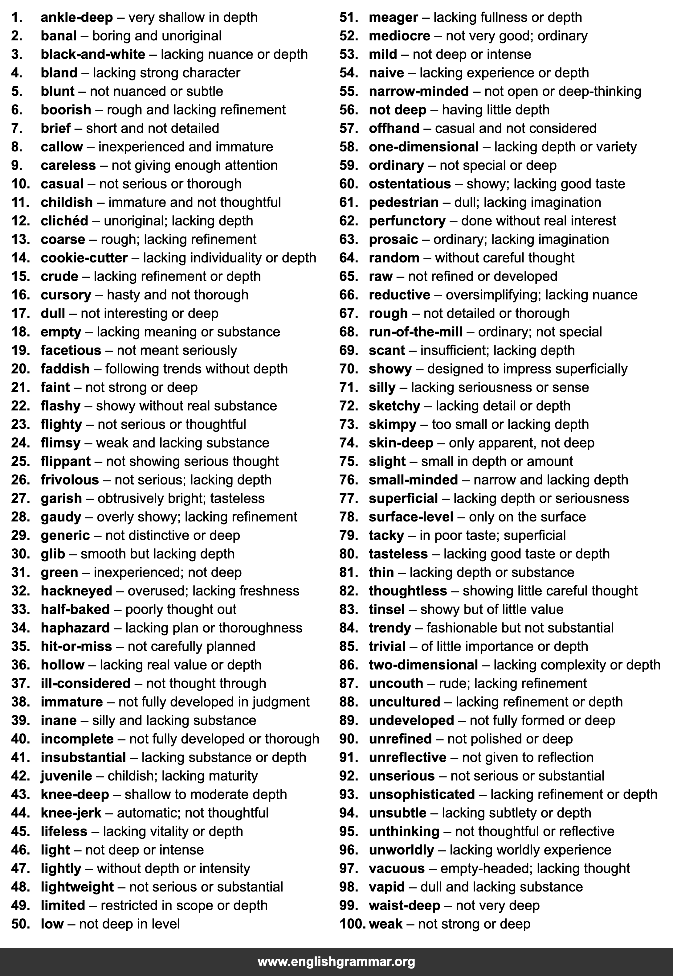 | 77. | superficial | lacking depth or seriousness |