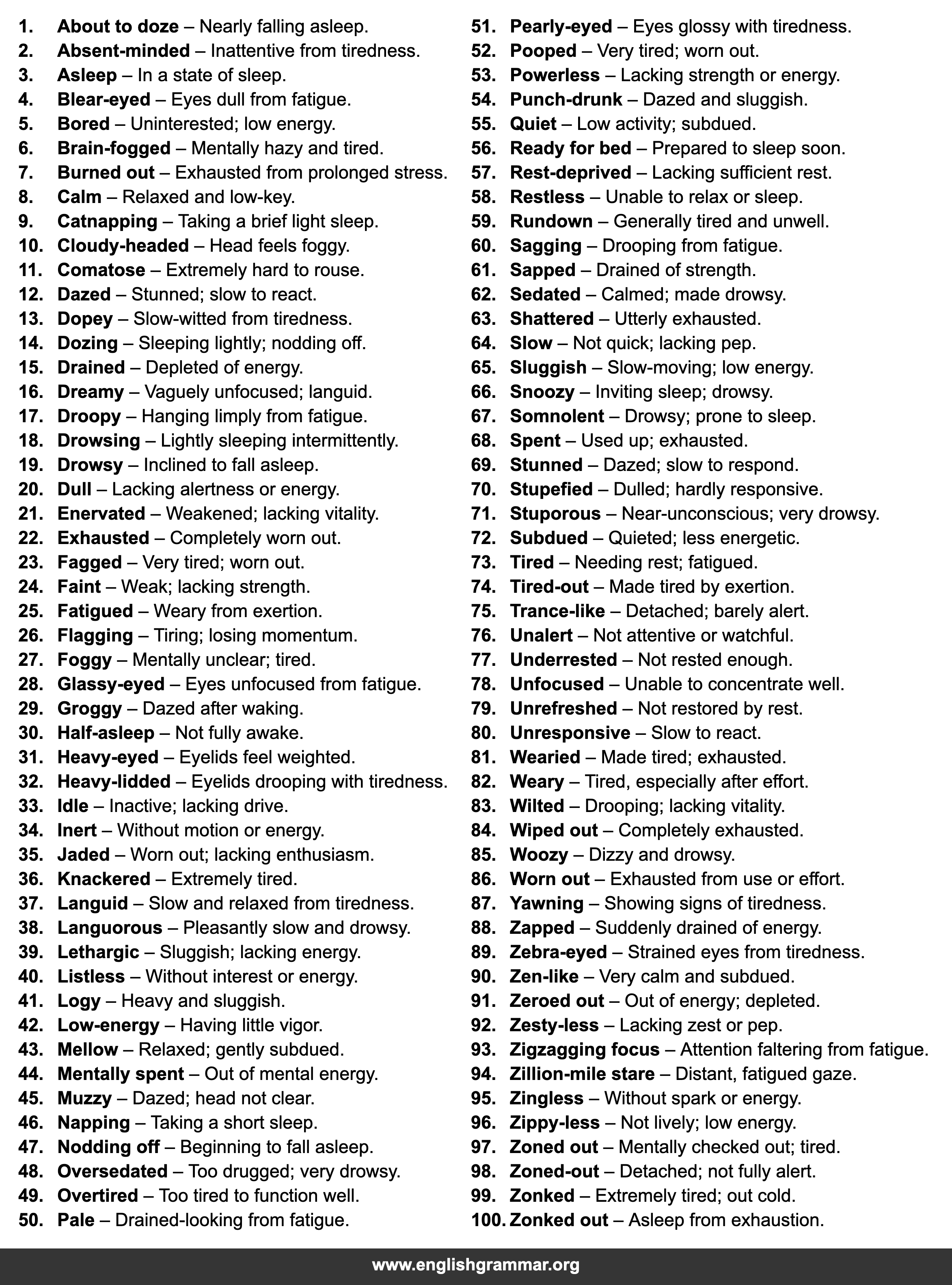 | 15. | Drained | Depleted of energy. |