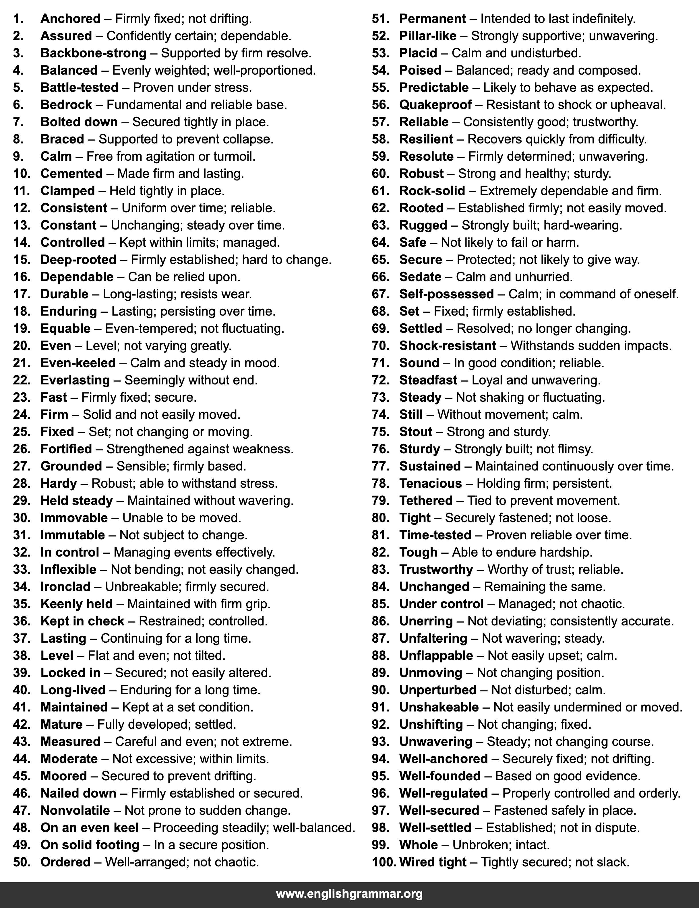 | 91. | Unshakeable | Not easily undermined or moved. |