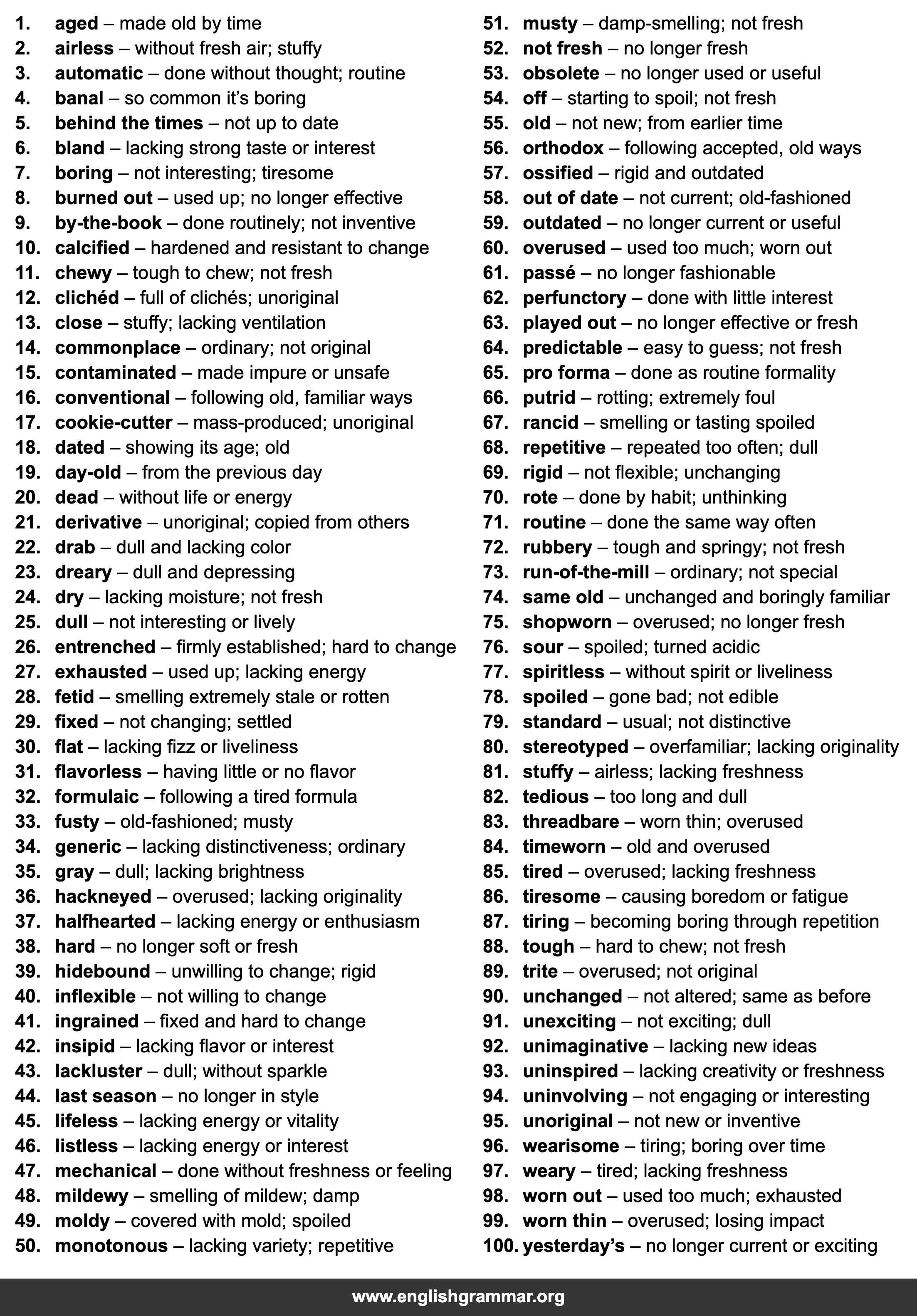 | 93. | uninspired | lacking creativity or freshness |