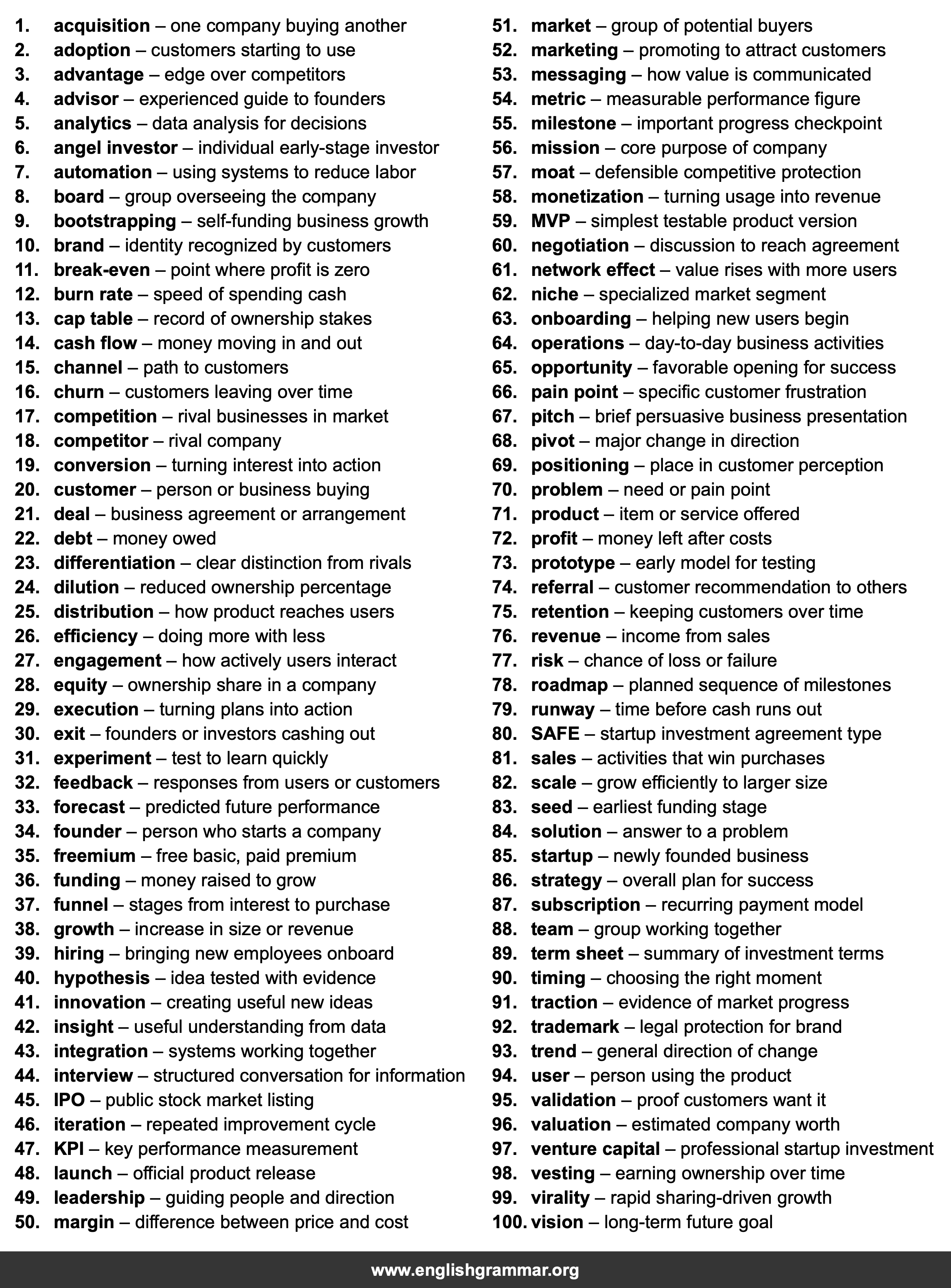 | 30. | exit | founders or investors cashing out |