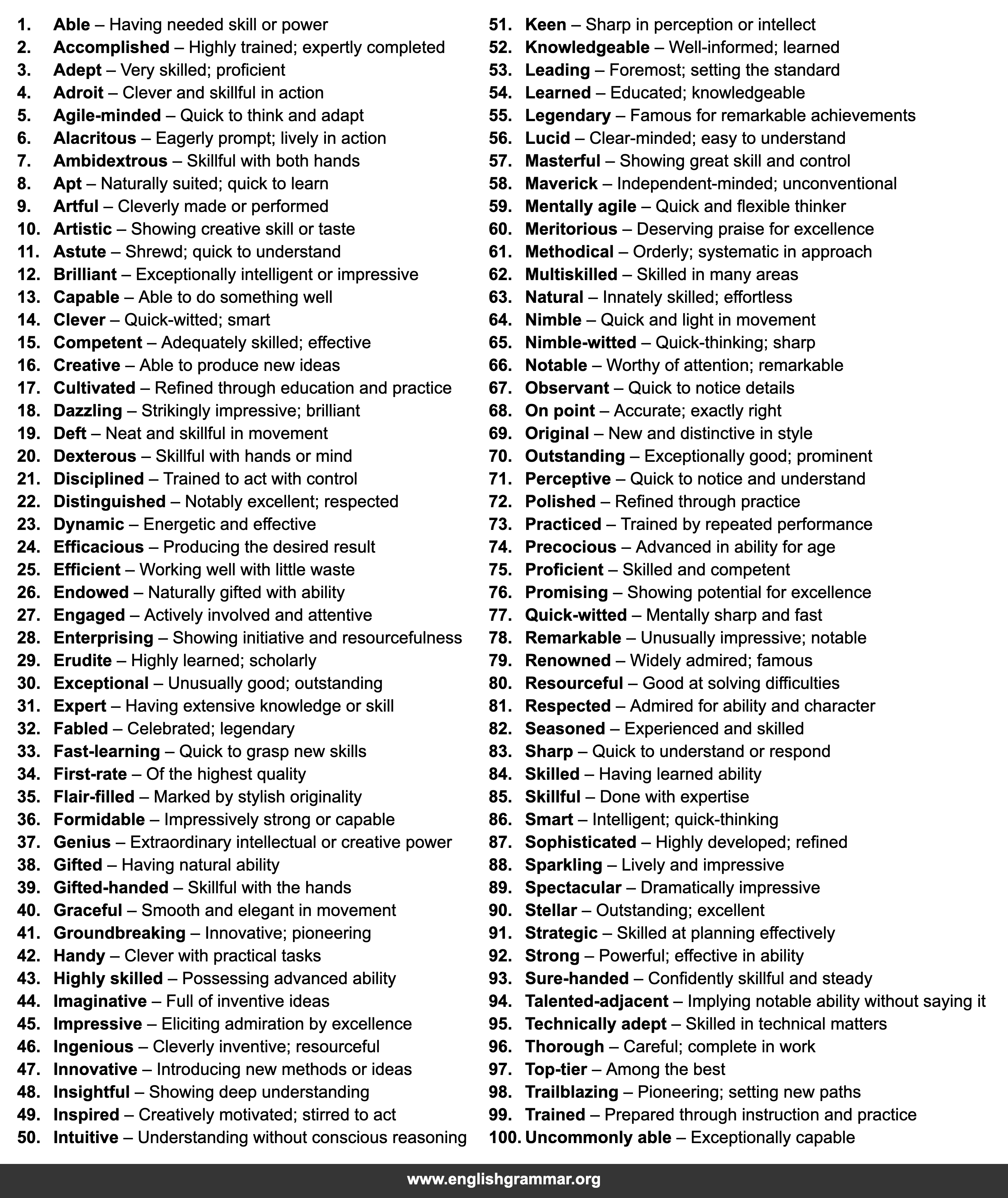 | 100. | Uncommonly able | Exceptionally capable |