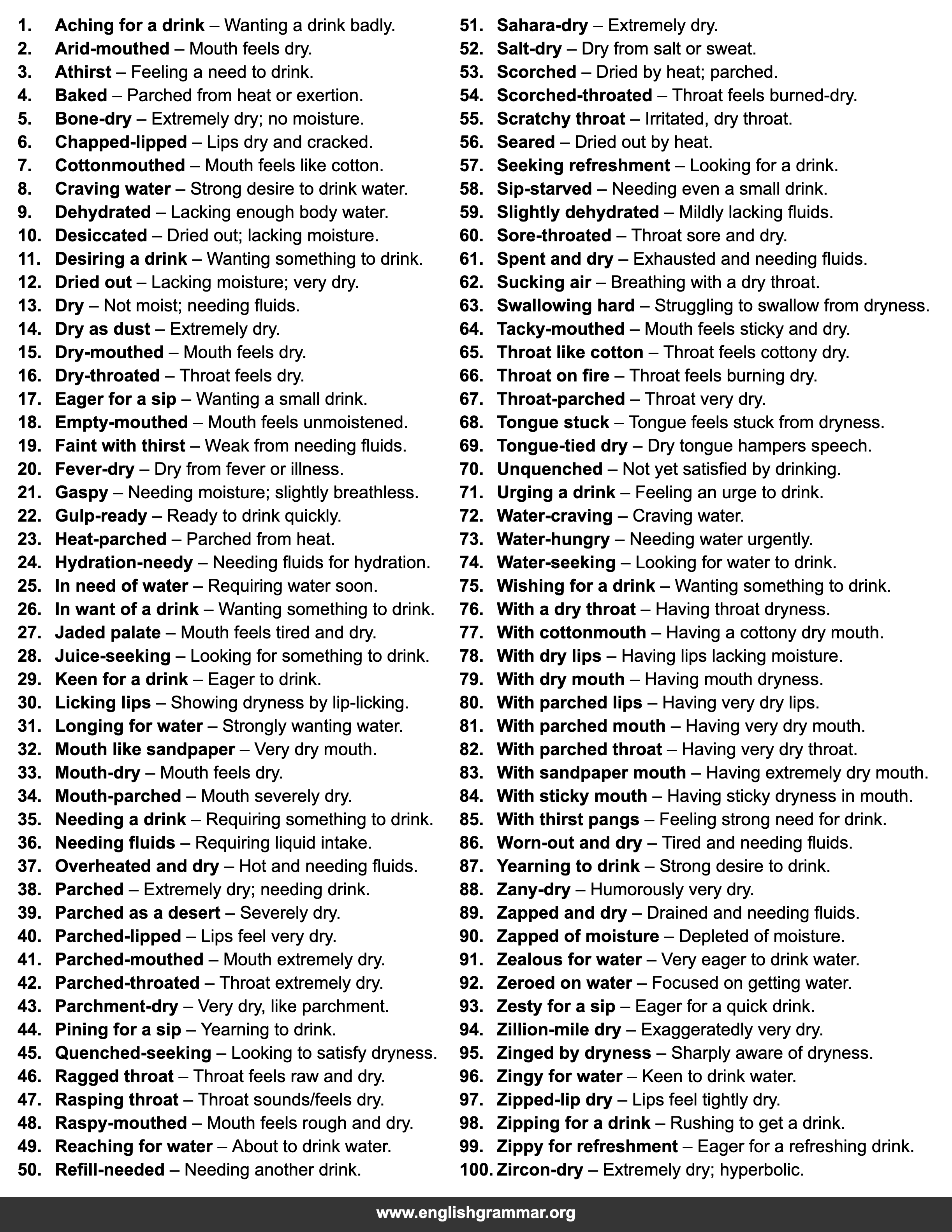 | 7. | Cottonmouthed | Mouth feels like cotton. |