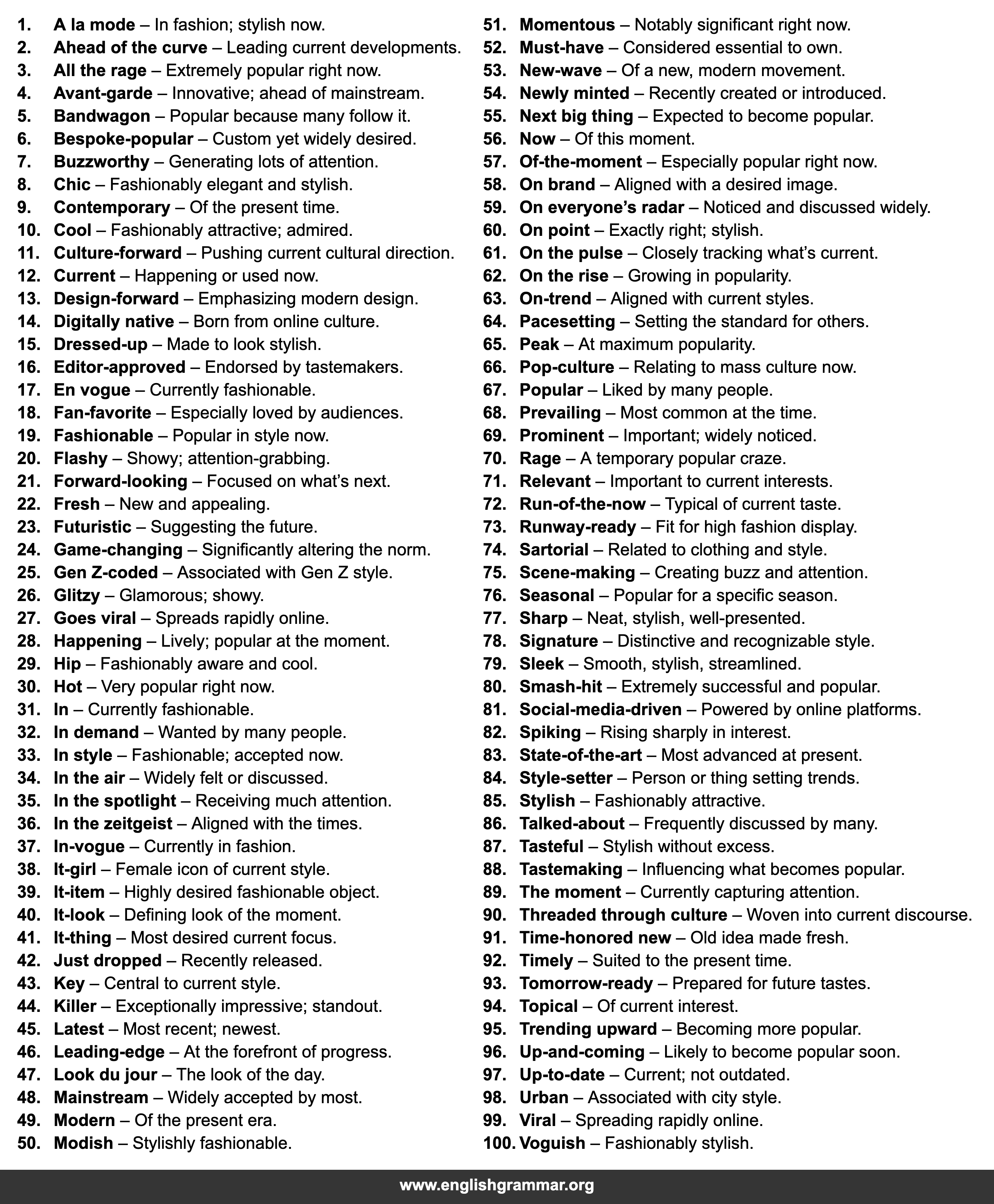 | 100. | Voguish | Fashionably stylish. |