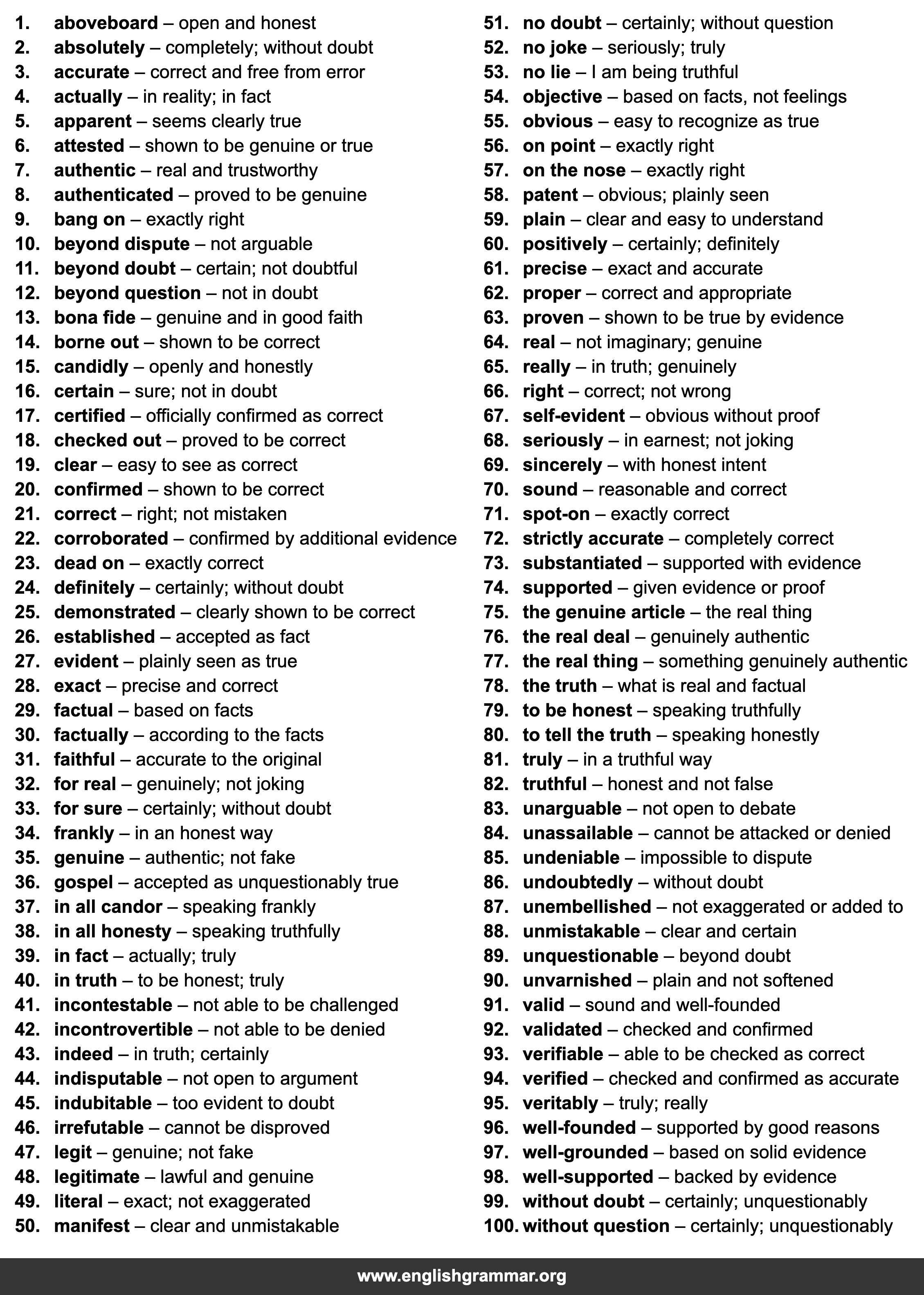 | 89. | unquestionable | beyond doubt |