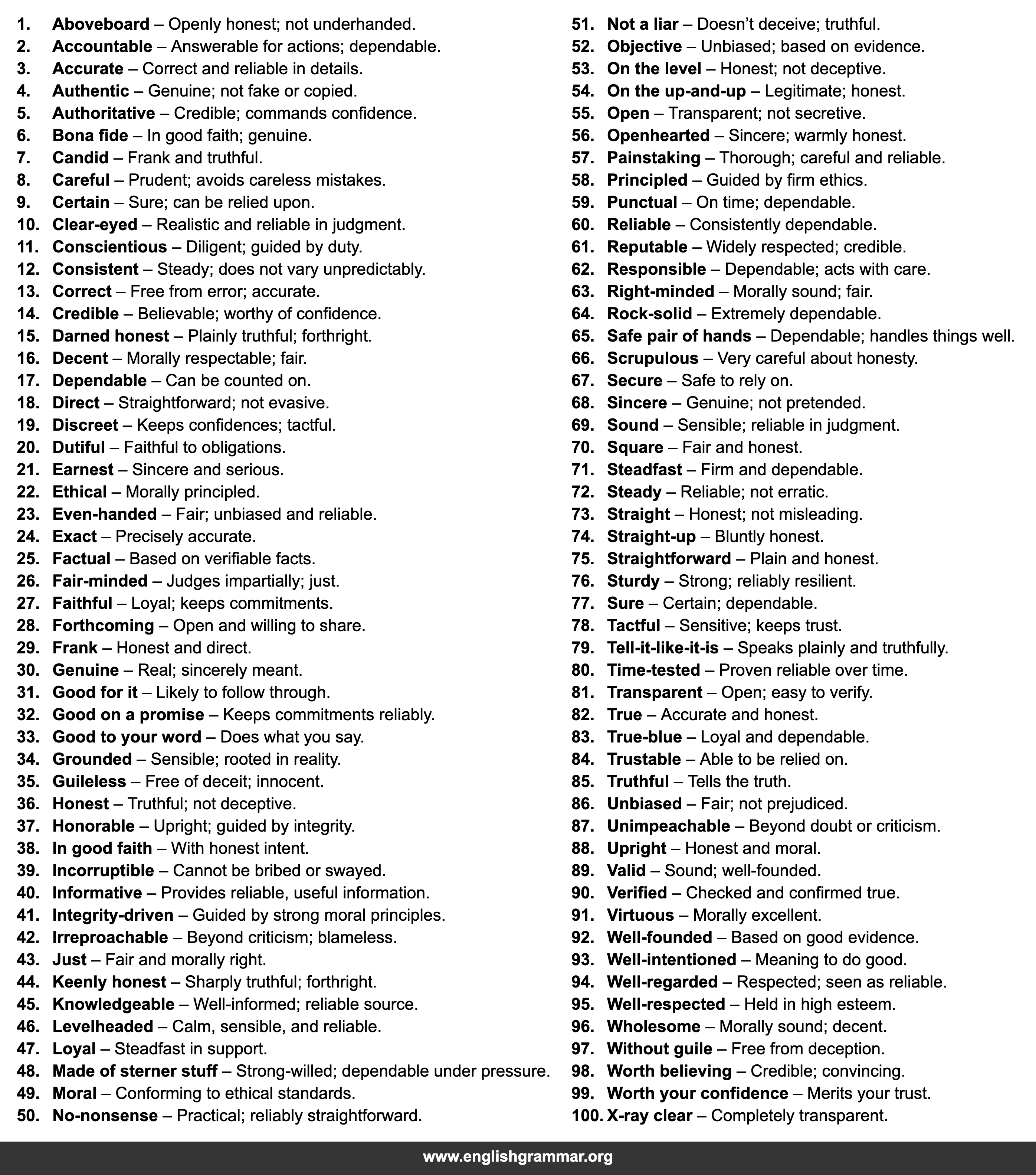 | 84. | Trustable | Able to be relied on. |