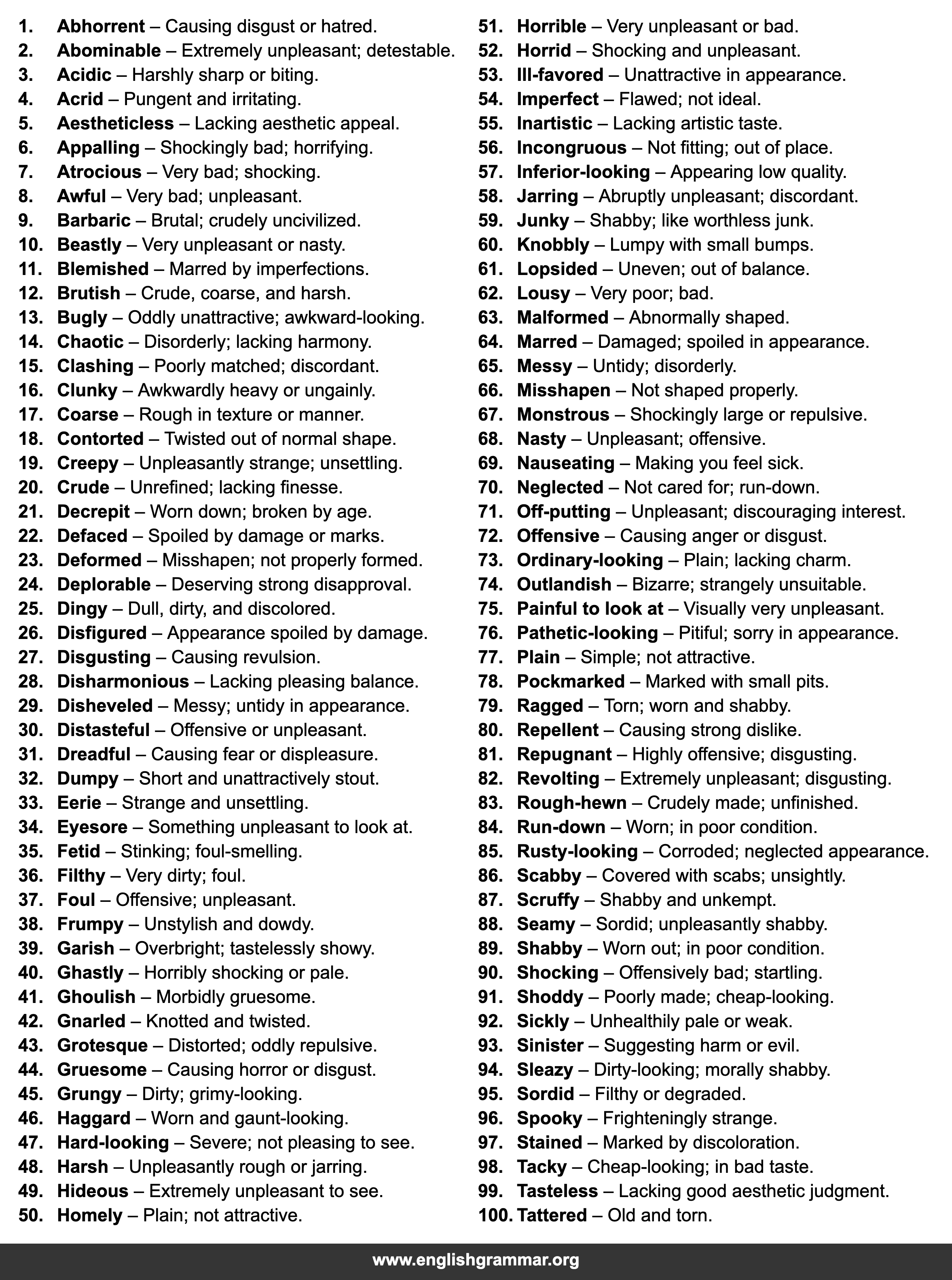 | 49. | Hideous | Extremely unpleasant to see. |