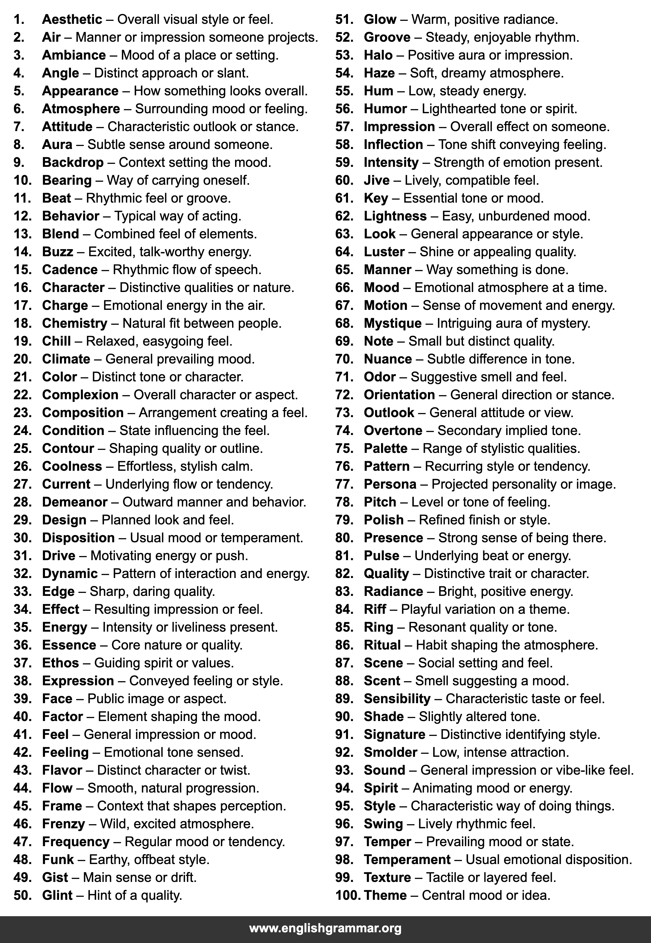 | 6. | Atmosphere | Surrounding mood or feeling. |