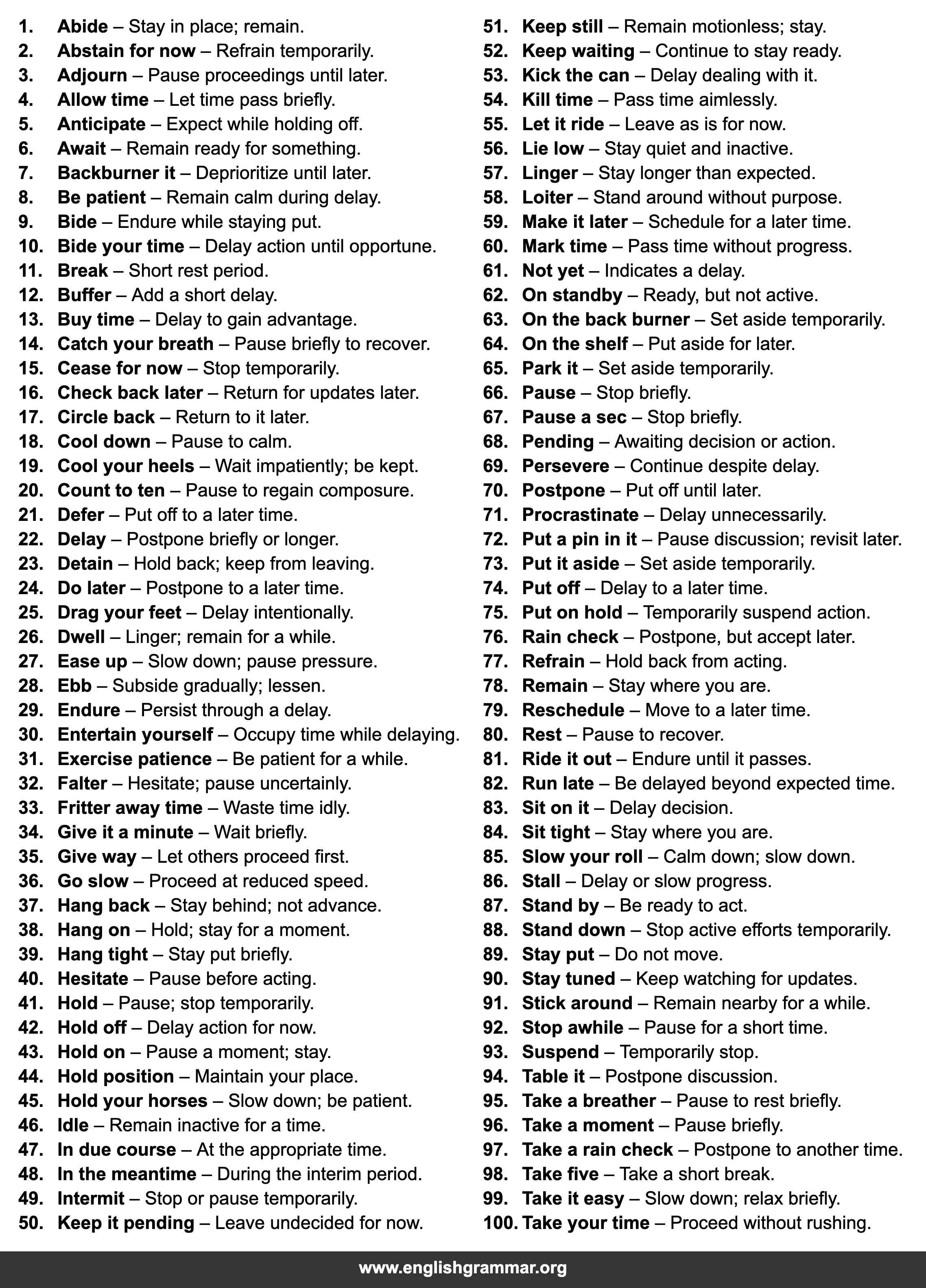 | 30. | Entertain yourself | Occupy time while delaying. |