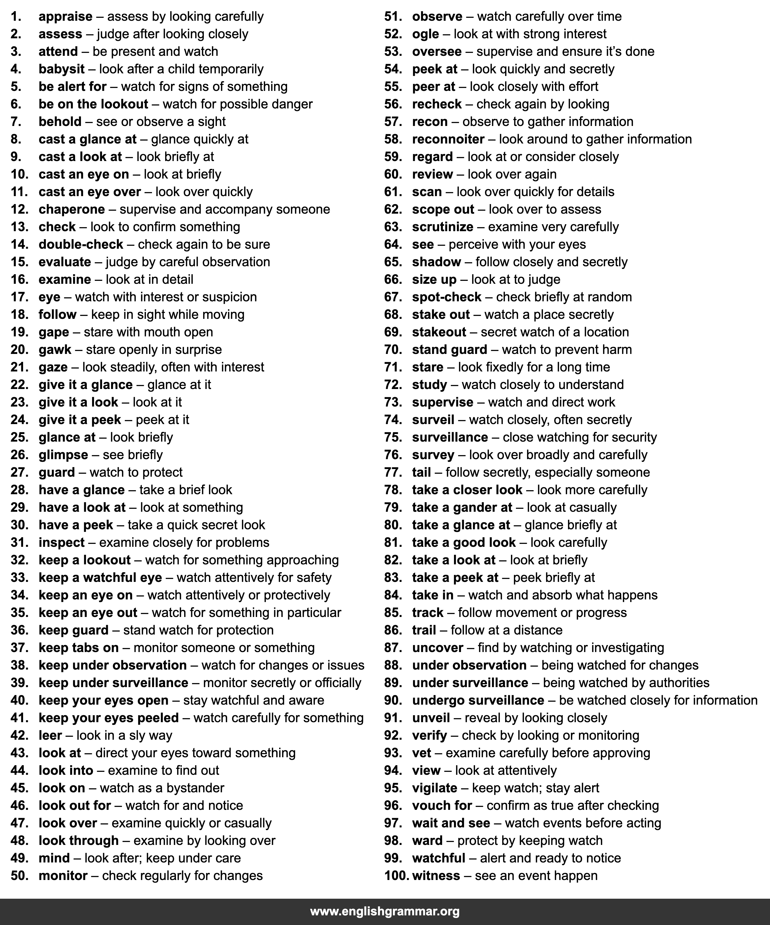| 100. | witness | see an event happen |