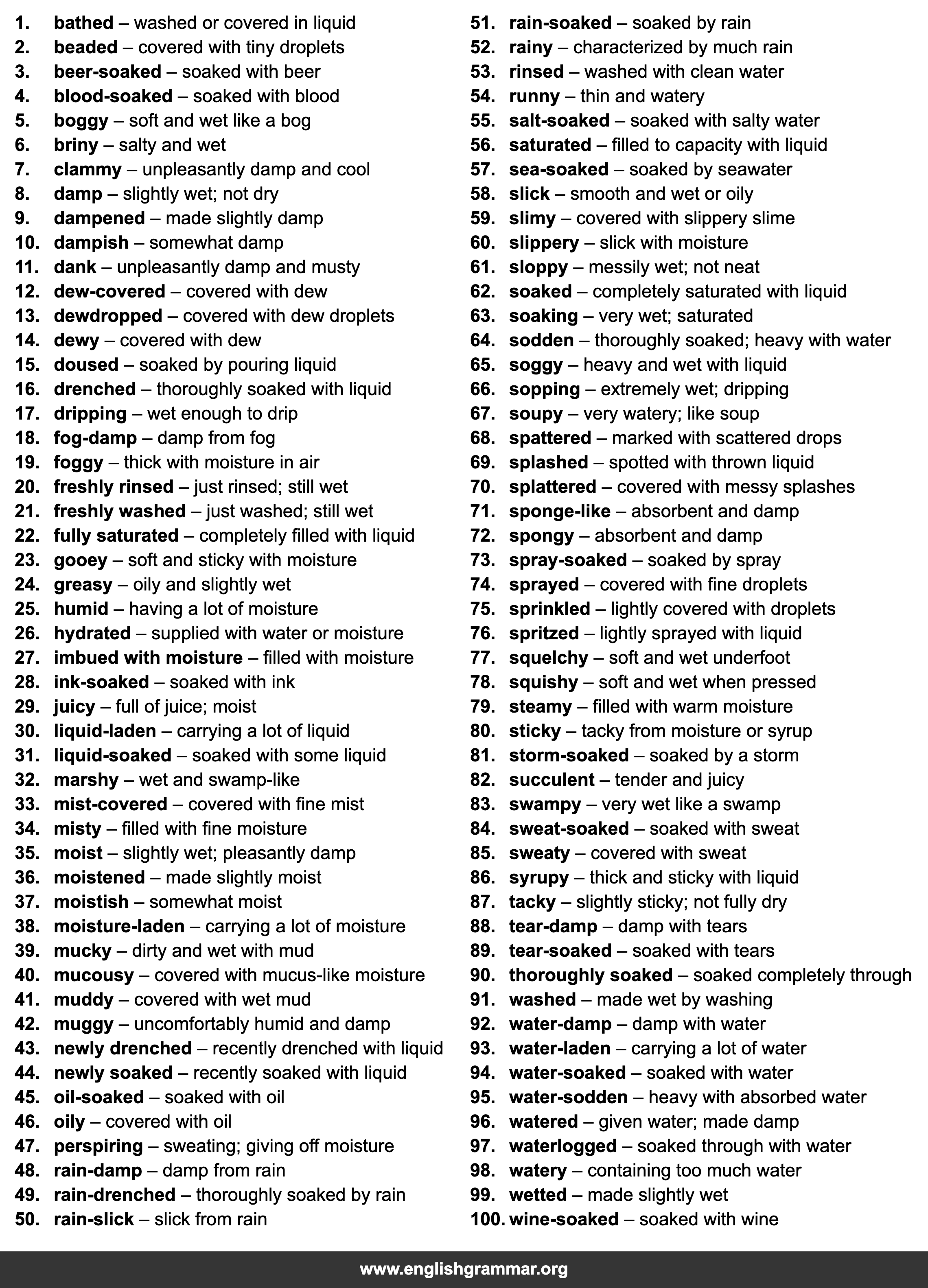 | 49. | rain-drenched | thoroughly soaked by rain |