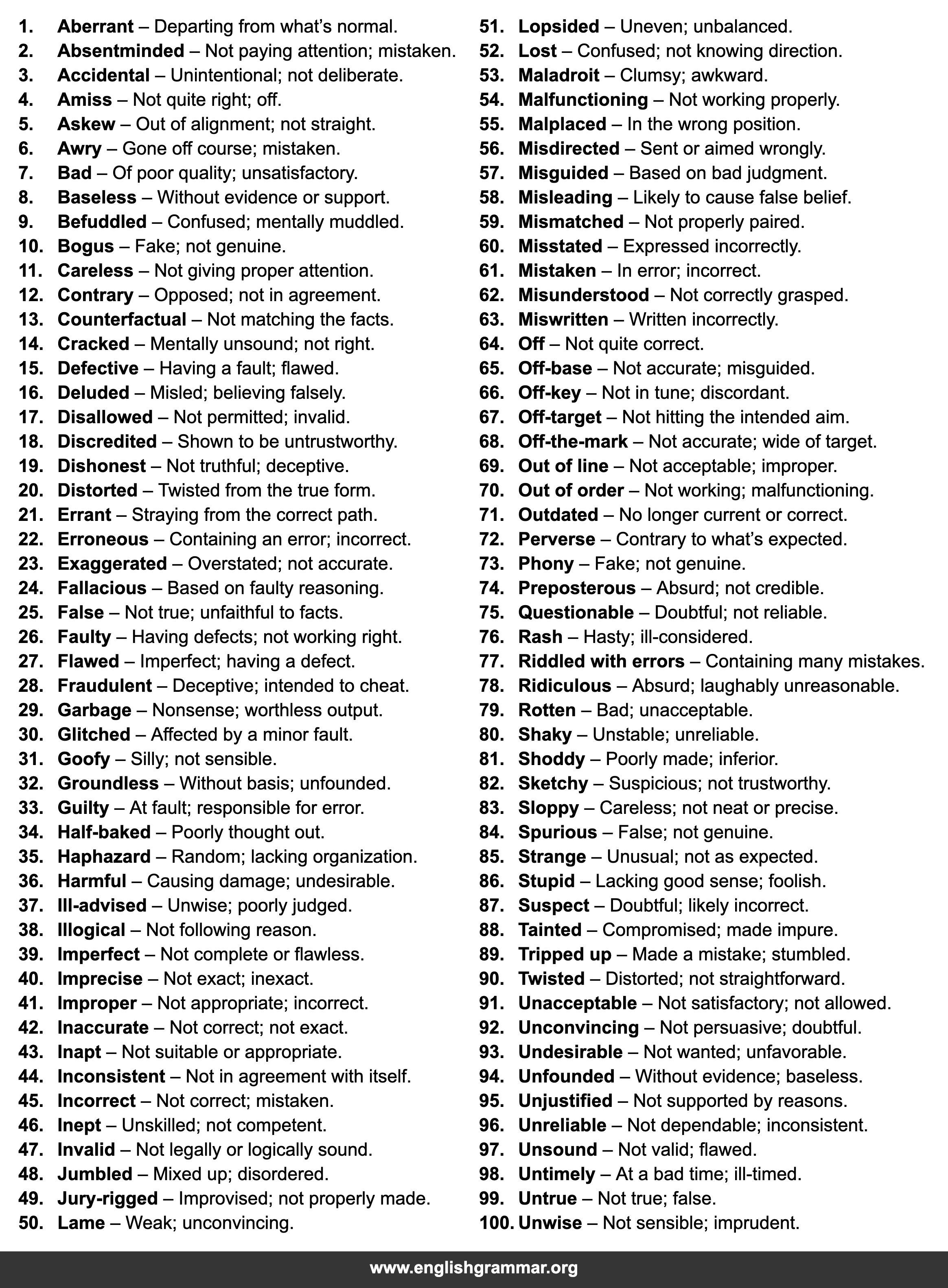 | 45. | Incorrect | Not correct; mistaken. |