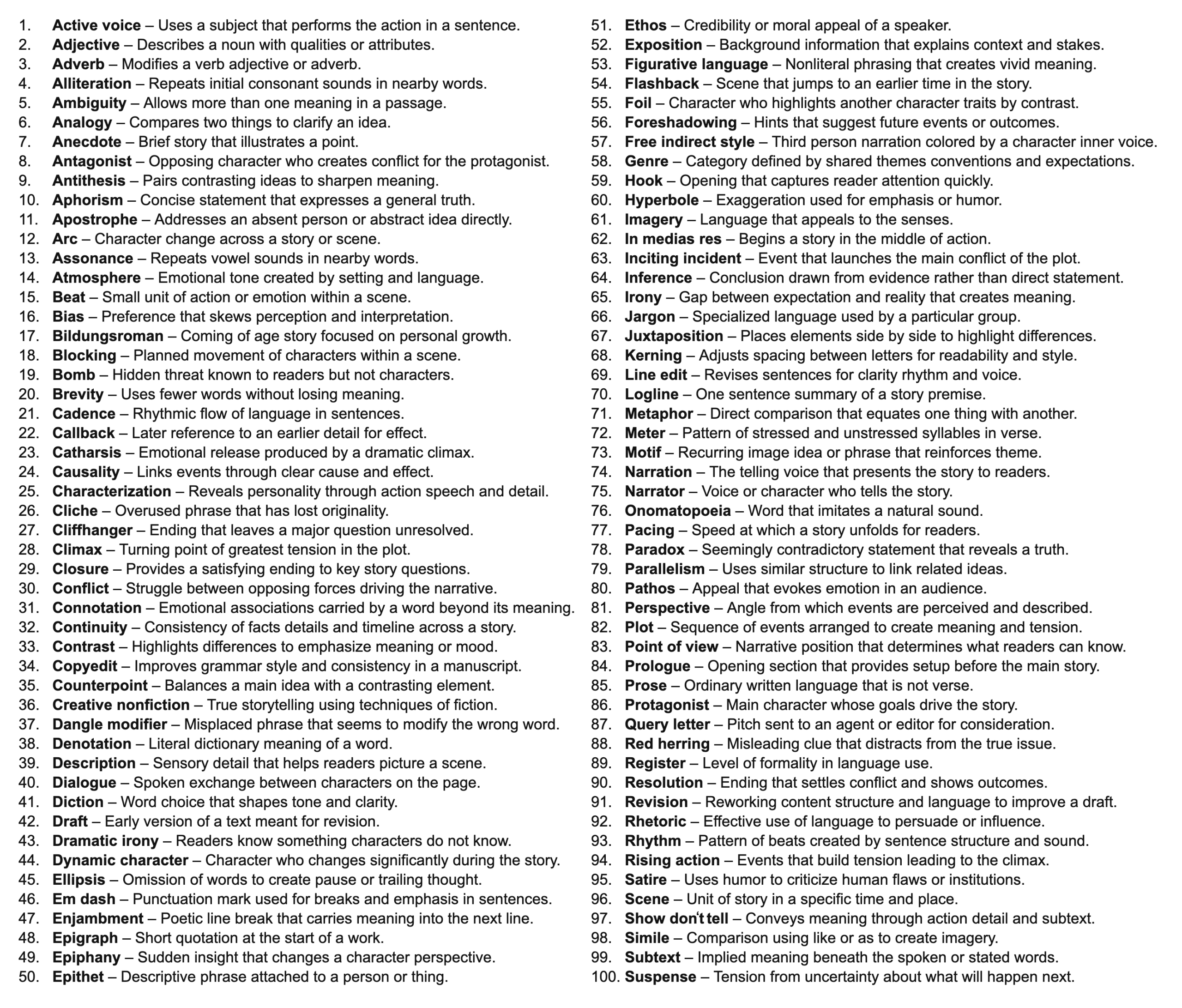 | 77. | Pacing | Speed at which a story unfolds for readers. |